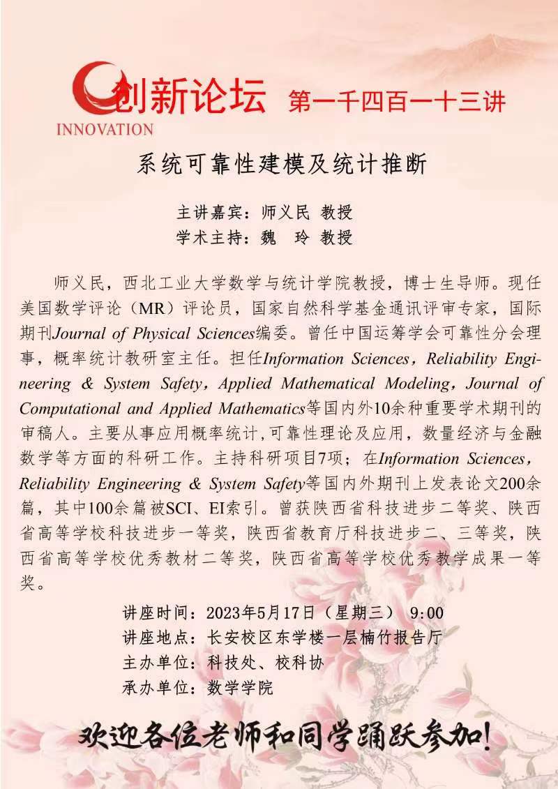 师义民 教授 乐投平台创新论坛第一千四百一十三讲:系统可靠性建模及统计推断 讲座时间 2023年5月17日(星期三) 9:00 讲座地点 长安校区东学楼一层楠竹报告厅 讲座人介绍 师义民 教授 讲座内容
