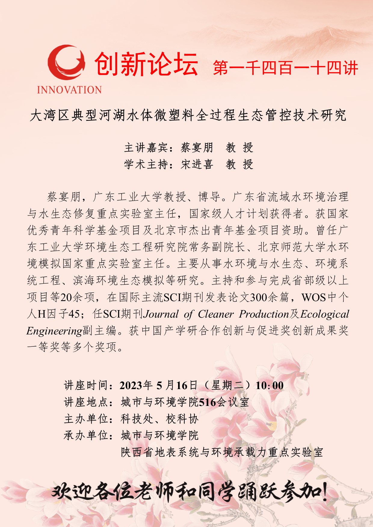 蔡宴朋 教 授 乐投平台创新论坛第一千四百一十四讲:大湾区典型河湖水体微塑料全过程生态管控技术研究 讲座时间 2023年 5 月16日(星期二)10:00 讲座地点 城市与环境学院516会议室 讲座人介绍 蔡宴朋 教 授 讲座内容