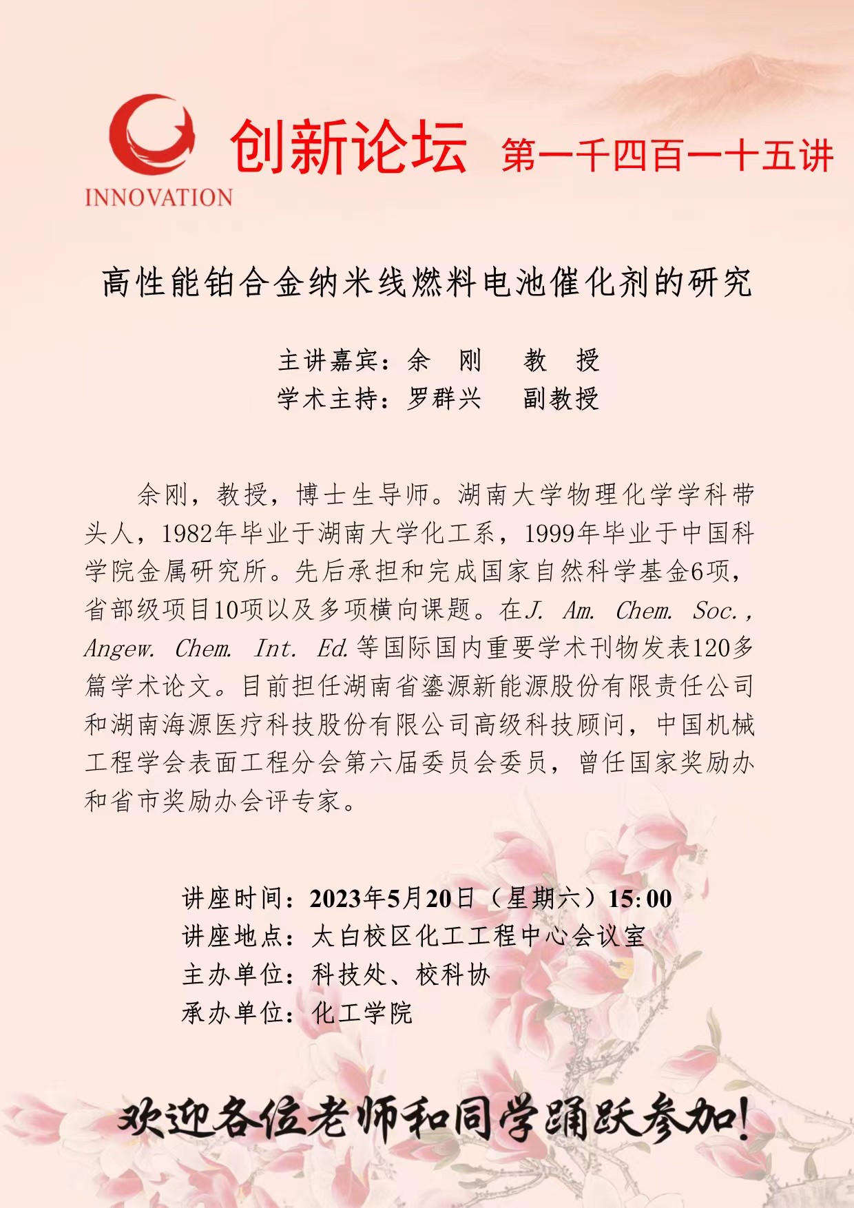 余 刚 教 授 乐投平台创新论坛第一千四百一十五讲:高性能铂合金纳米线燃料电池催化剂的研究 讲座时间 2023年5月20日(星期六)15:00 讲座地点 太白校区化工工程中心会议室 讲座人介绍 余 刚 教 授 讲座内容