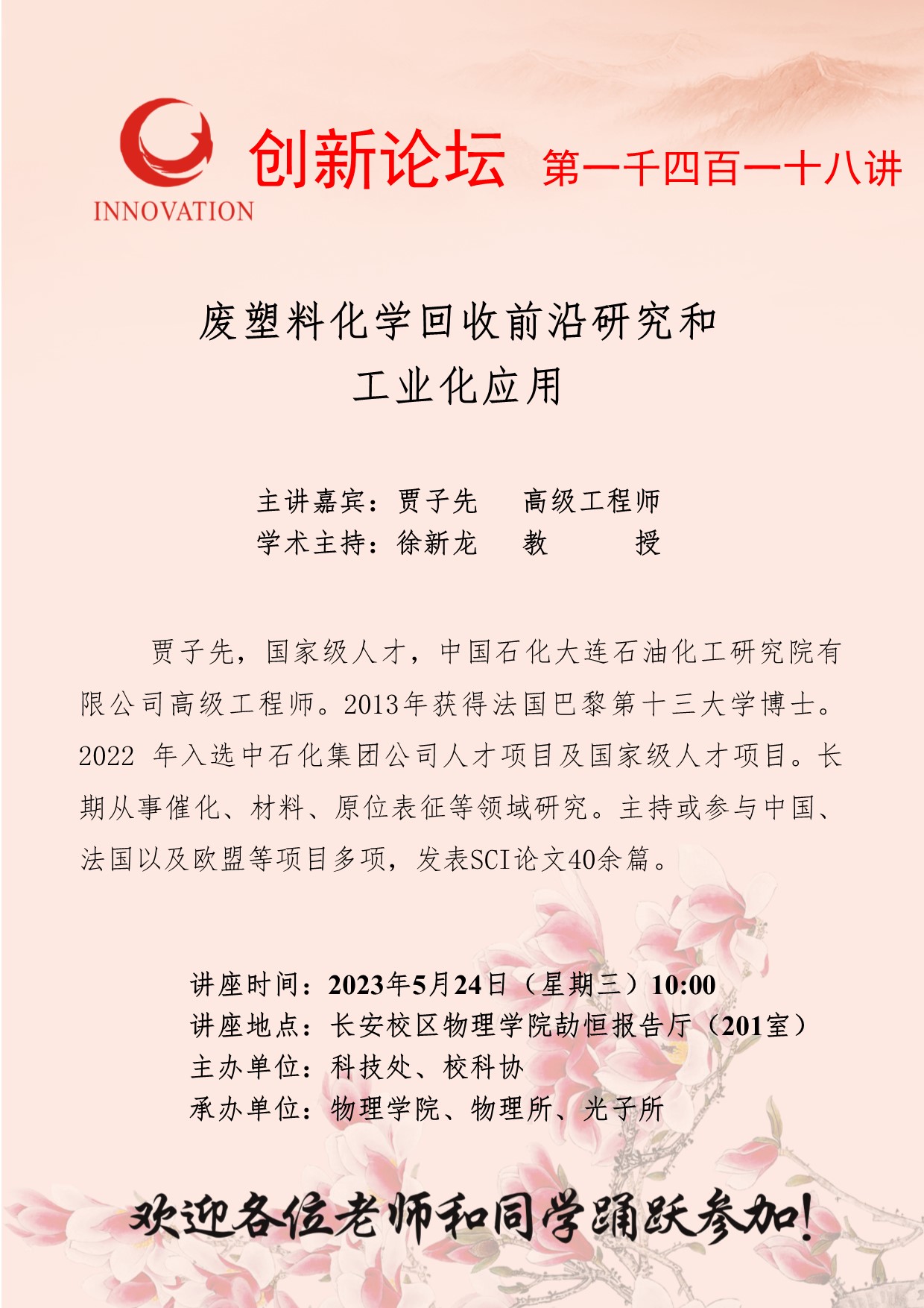 贾子先 高级工程师 乐投平台创新论坛第一千四百一十八讲:废塑料化学回收前沿研究和工业化应用 讲座时间 2023年5月24日(星期三)10:00 讲座地点 长安校区物理学院劼恒报告厅(201室) 讲座人介绍 贾子先 高级工程师 讲座内容