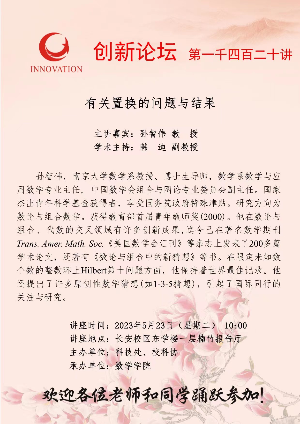 孙智伟 教 授 乐投平台创新论坛第一千四百二十讲:有关置换的问题与结果 讲座时间 2023年5月23日(星期二) 10:00 讲座地点 长安校区东学楼一层楠竹报告厅 讲座人介绍 孙智伟 教 授 讲座内容