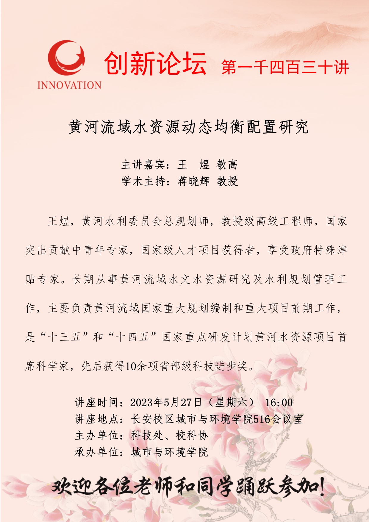 王 煜 教高 乐投平台创新论坛第一千四百三十讲:黄河流域水资源动态均衡配置研究 讲座时间 2023年5月27日(星期六) 16:00 讲座地点 长安校区城市与环境学院516会议室 讲座人介绍 王 煜 教高 讲座内容