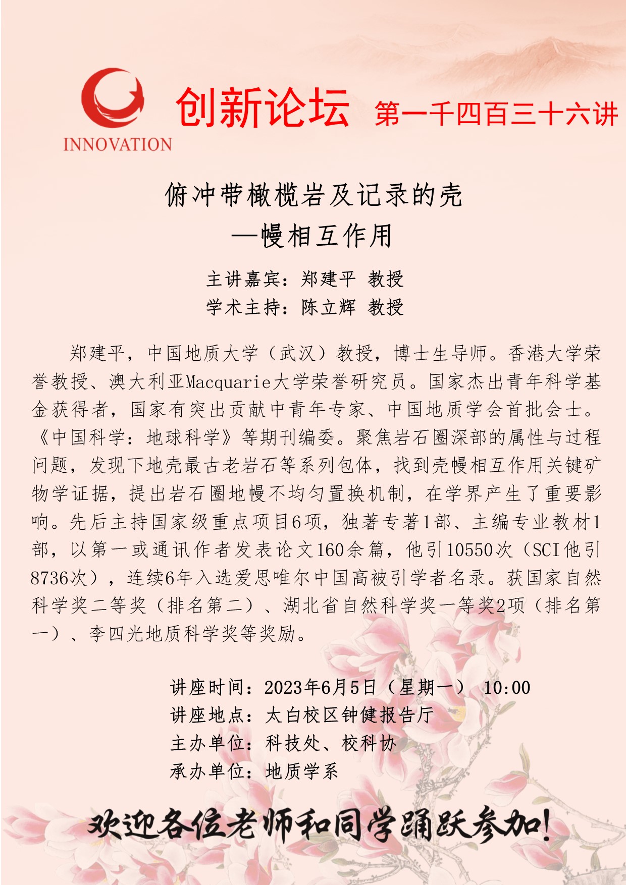 郑建平 教授 乐投平台创新论坛第一千四百三十六讲:俯冲带橄榄岩及记录的壳—幔相互作用 讲座时间 2023年6月5日(星期一) 10:00 讲座地点 太白校区钟健报告厅 讲座人介绍 郑建平 教授 讲座内容