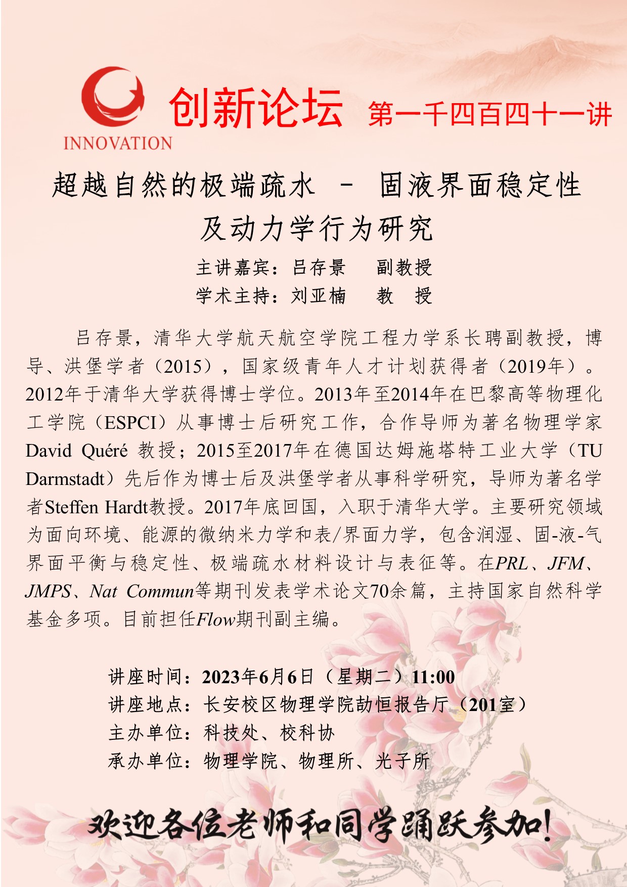 吕存景 副教授 乐投平台创新论坛第一千四百四十一讲:超越自然的极端疏水 – 固液界面稳定性及动力学行为研究 讲座时间 2023年6月6日(星期二)11:00 讲座地点 长安校区物理学院劼恒报告厅(201室) 讲座人介绍 吕存景 副教授 讲座内容