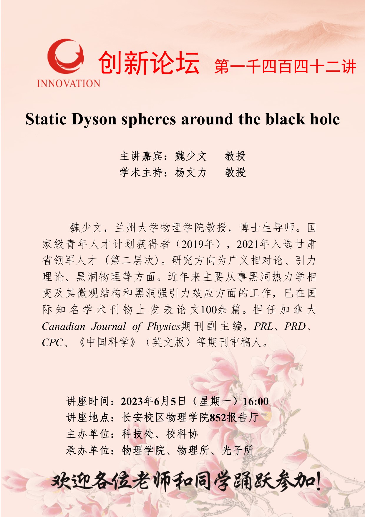 魏少文 教授 乐投平台创新论坛第一千四百四十二讲:Static Dyson spheres around the black hole 讲座时间 2023年6月5日(星期一)16:00 讲座地点 长安校区物理学院852报告厅 讲座人介绍 魏少文 教授 讲座内容