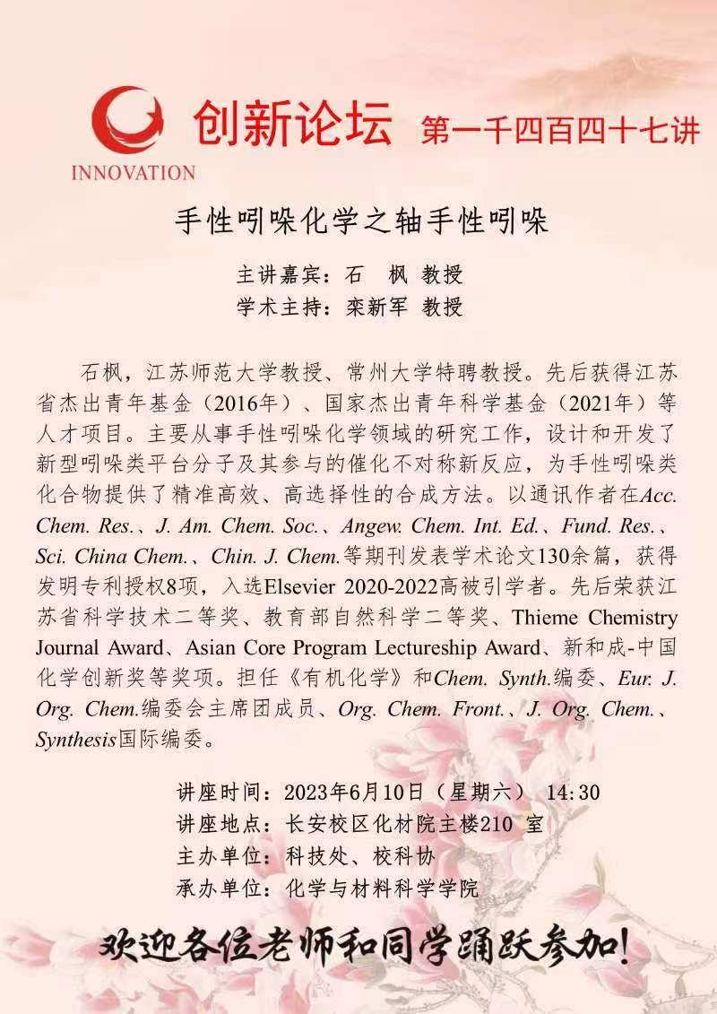 石 枫 教授 乐投平台创新论坛第一千四百四十七讲:手性吲哚化学之轴手性吲哚 讲座时间 2023年6月10日(星期六) 14:30 讲座地点 长安校区化材院主楼210 室 讲座人介绍 石 枫 教授 讲座内容
