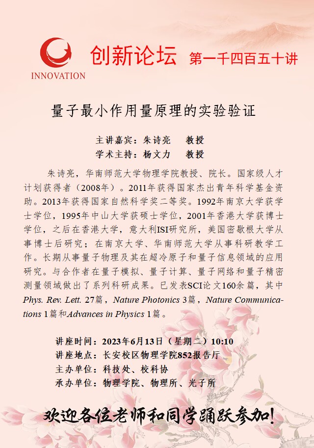 朱诗亮 教授 乐投平台创新论坛第一千四百五十讲:量子最小作用量原理的实验验证 讲座时间 2023年6月13日(星期二)10:10 讲座地点 长安校区物理学院852报告厅 讲座人介绍 朱诗亮 教授 讲座内容