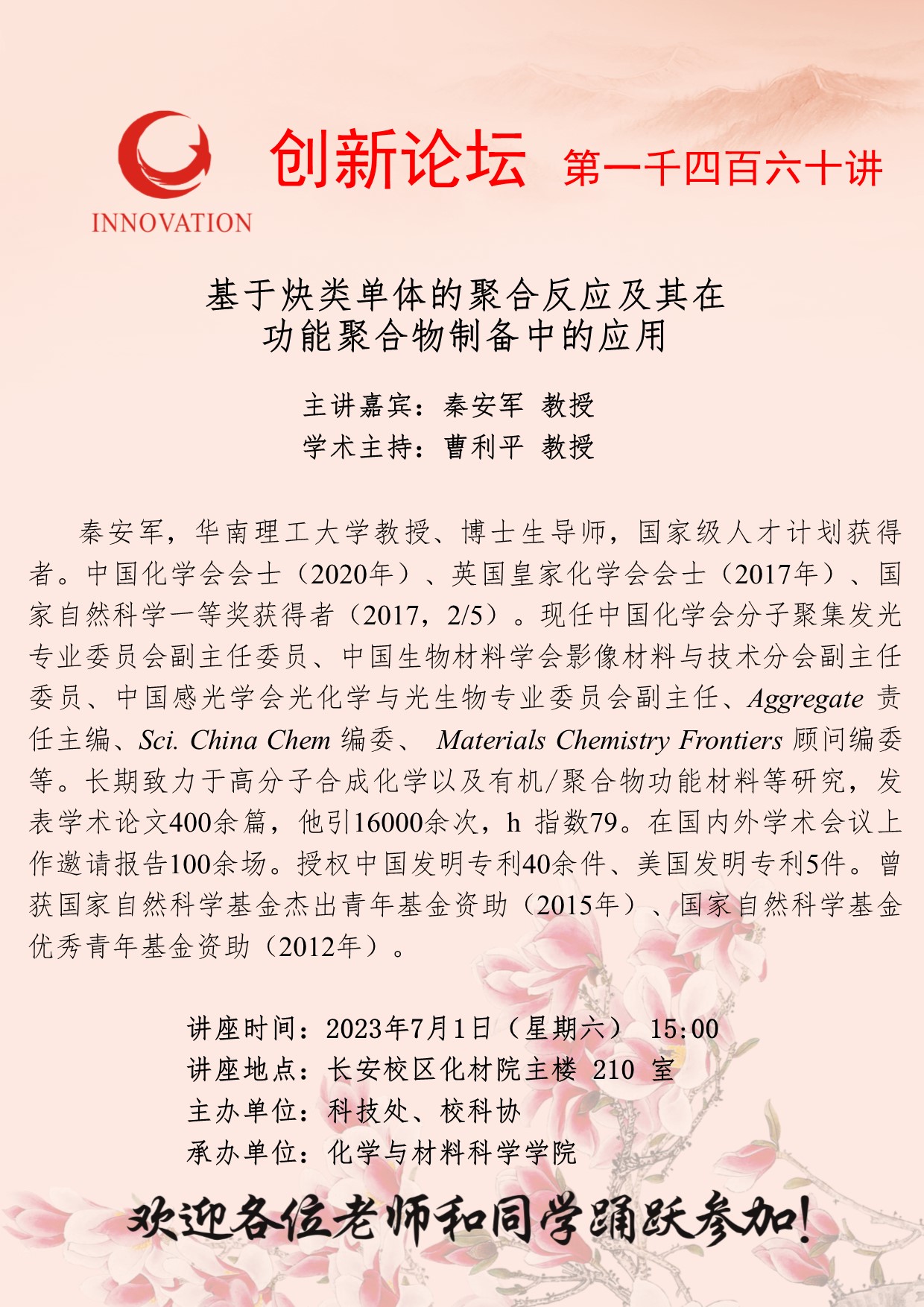 秦安军 教授 乐投平台创新论坛第一千四百六十讲:基于炔类单体的聚合反应及其在功能聚合物制备中的应用 讲座时间 2023年7月1日(星期六) 15:00 讲座地点 长安校区化材院主楼 210 室 讲座人介绍 秦安军 教授 讲座内容