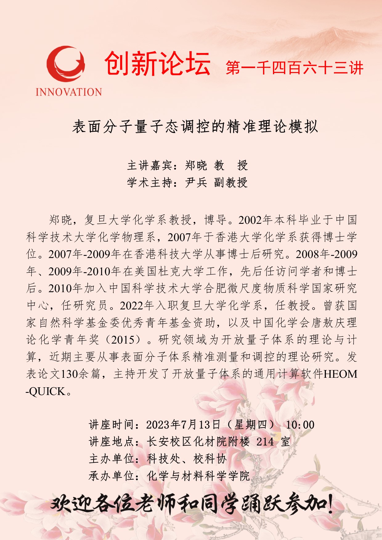 郑晓 教授 乐投平台创新论坛第一千四百六十三讲:表面分子量子态调控的精准理论模拟 讲座时间 023年7月13日(星期四) 10:00 讲座地点 长安校区化材院附楼214室 讲座人介绍 郑晓 教授 讲座内容