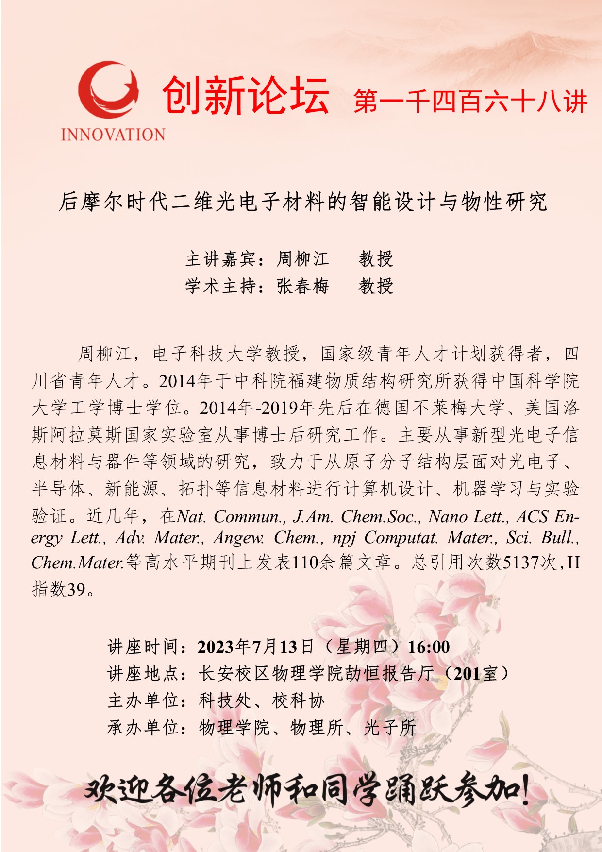 周柳江 教授 乐投平台创新论坛第一千四百六十八讲:后摩尔时代二维光电子材料的智能设计与物性研究 讲座时间 2023年7月13日(星期四)16:00 讲座地点 长安校区物理学院劼恒报告厅(201室) 讲座人介绍 周柳江 教授 讲座内容
