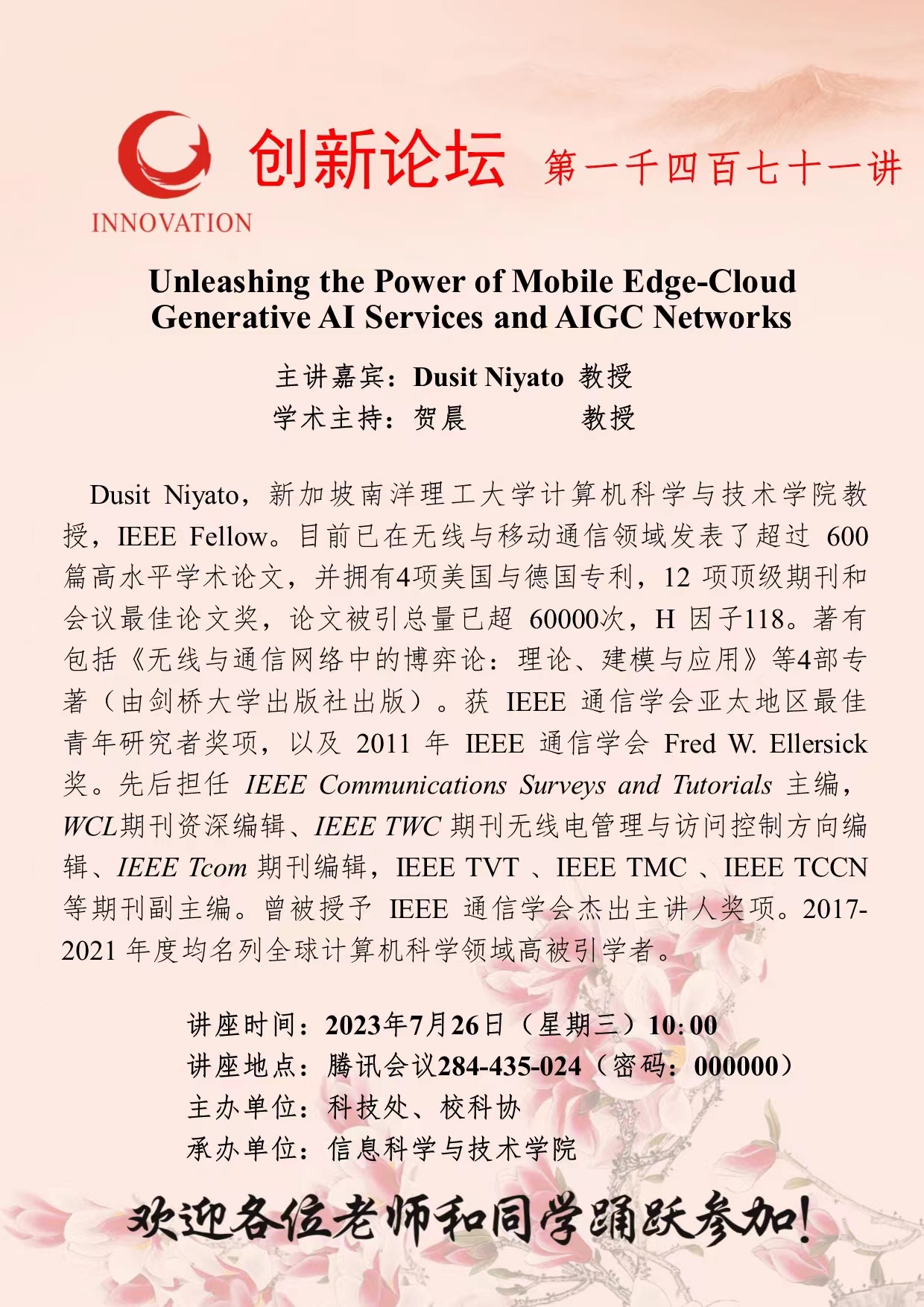 Dusit Niyato 教授 乐投平台创新论坛第一千四百七十一讲:Unleashing the Power of Mobile Edge-Cloud Generative AI Services and AIGC Networks 讲座时间 2023年7月26日(星期三)10:00 讲座地点 腾讯会议284-435-024(密码:000000) 讲座人介绍 Dusit Niyato 教授 讲座内容