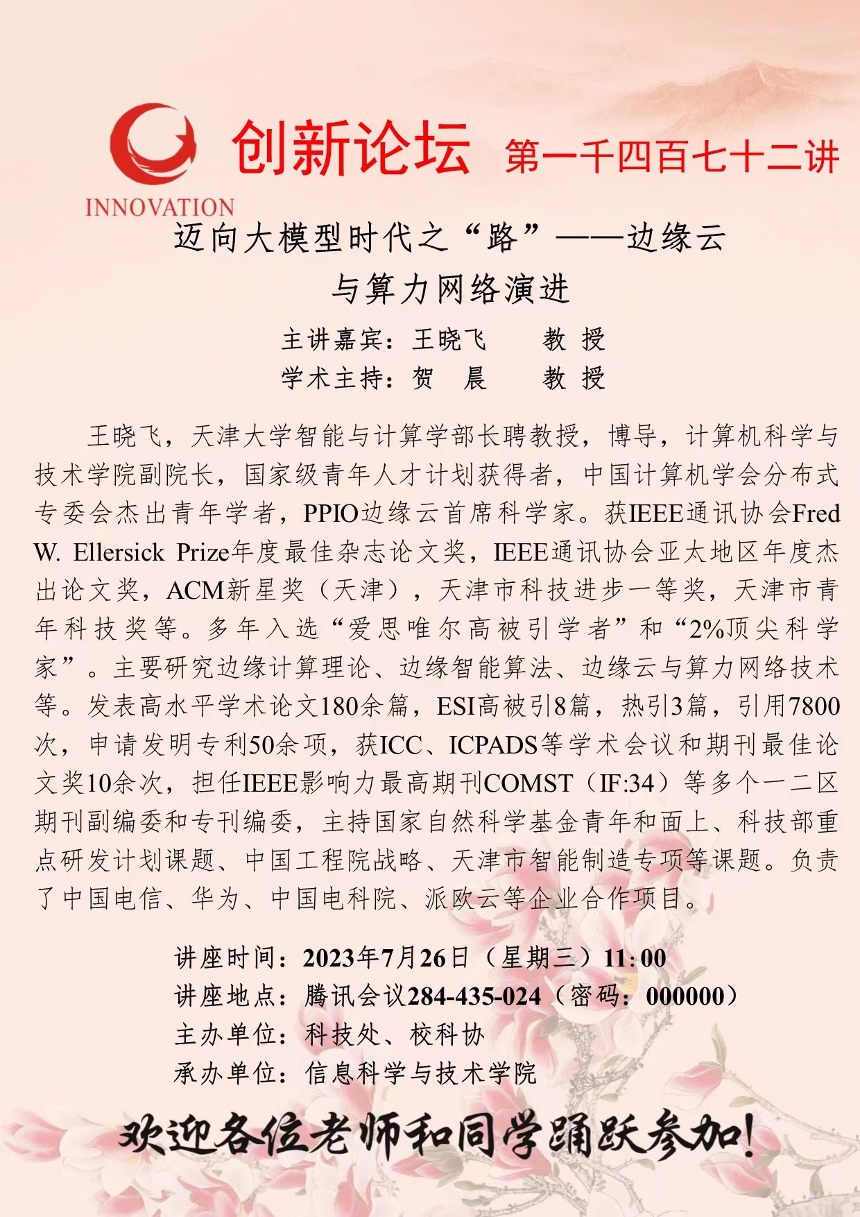 王晓飞 教授 乐投平台创新论坛第一千四百七十二讲:迈向大模型时代之“路”—边缘云与算力网络演进 讲座时间 2023年7月26日(星期三)11:00 讲座地点 腾讯会议284-435-024(密码:000000) 讲座人介绍 王晓飞 教授 讲座内容