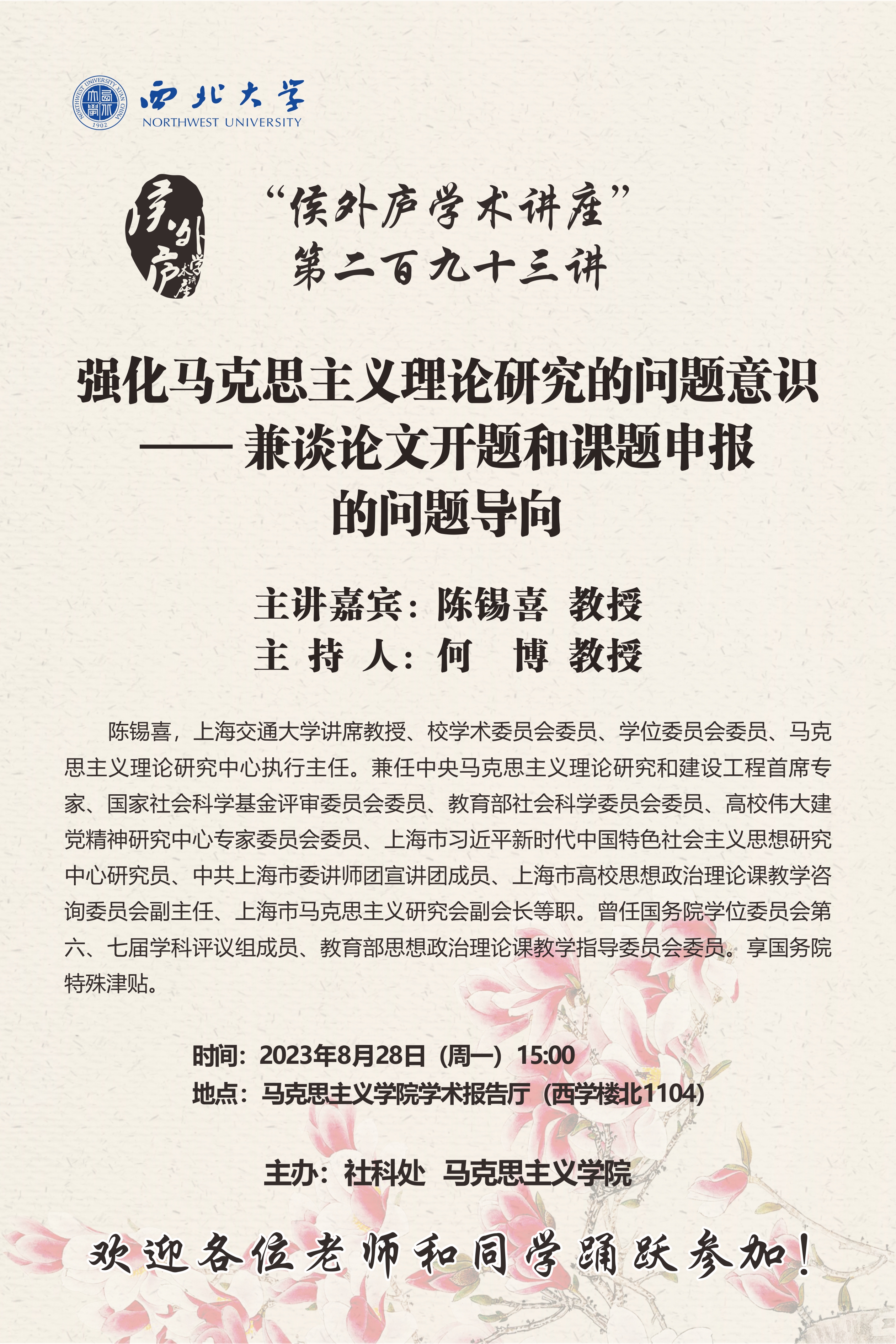 陈锡喜 教授 侯外庐学术讲座第二百九十三讲:强化马克思主义理论研究的问题意识 讲座时间 2023年8月28日(周一)15:00 讲座地点 马克思主义学院学术报告厅(西学楼北1104) 讲座人介绍 陈锡喜 教授 讲座内容