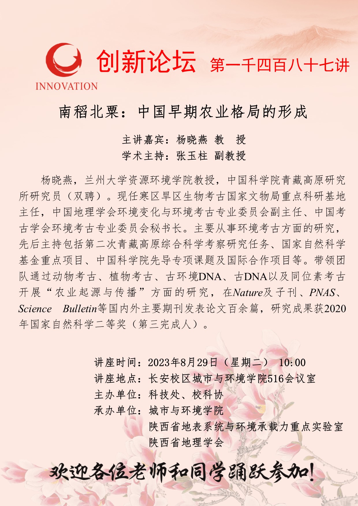 杨晓燕 教授 乐投平台创新论坛第一千四百八十七讲:南稻北粟:中国早期农业格局的形成 讲座时间 2023年8月29日(星期二) 10:00 讲座地点 长安校区城市与环境学院516会议室 讲座人介绍 杨晓燕 教授 讲座内容