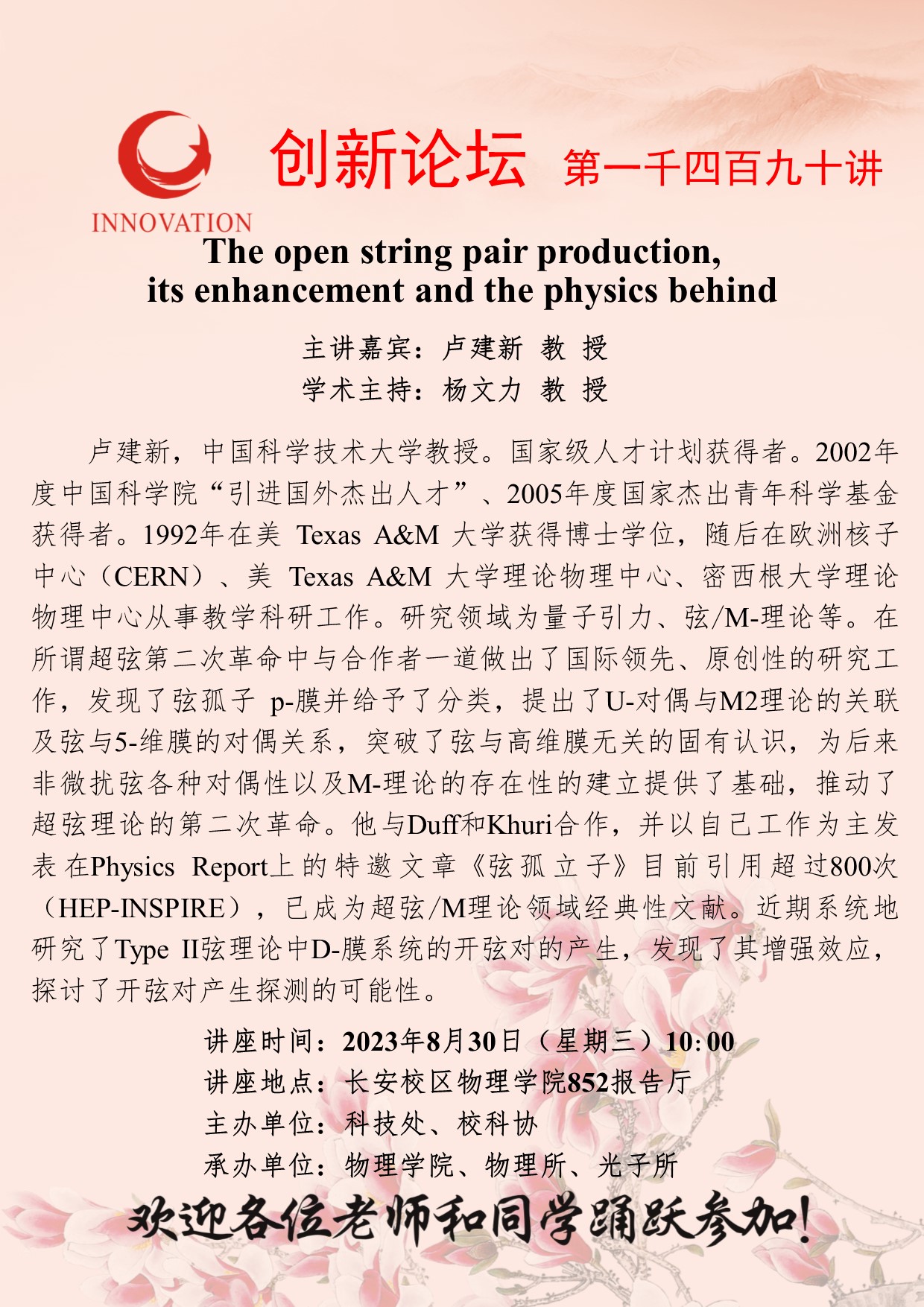 卢建新 教授 乐投平台创新论坛第一千四百九十讲:The open string pair production, its enhancement and the physics behind 讲座时间 2023年8月30日(星期三)10:00 讲座地点 长安校区物理学院852报告厅 讲座人介绍 卢建新 教授 讲座内容