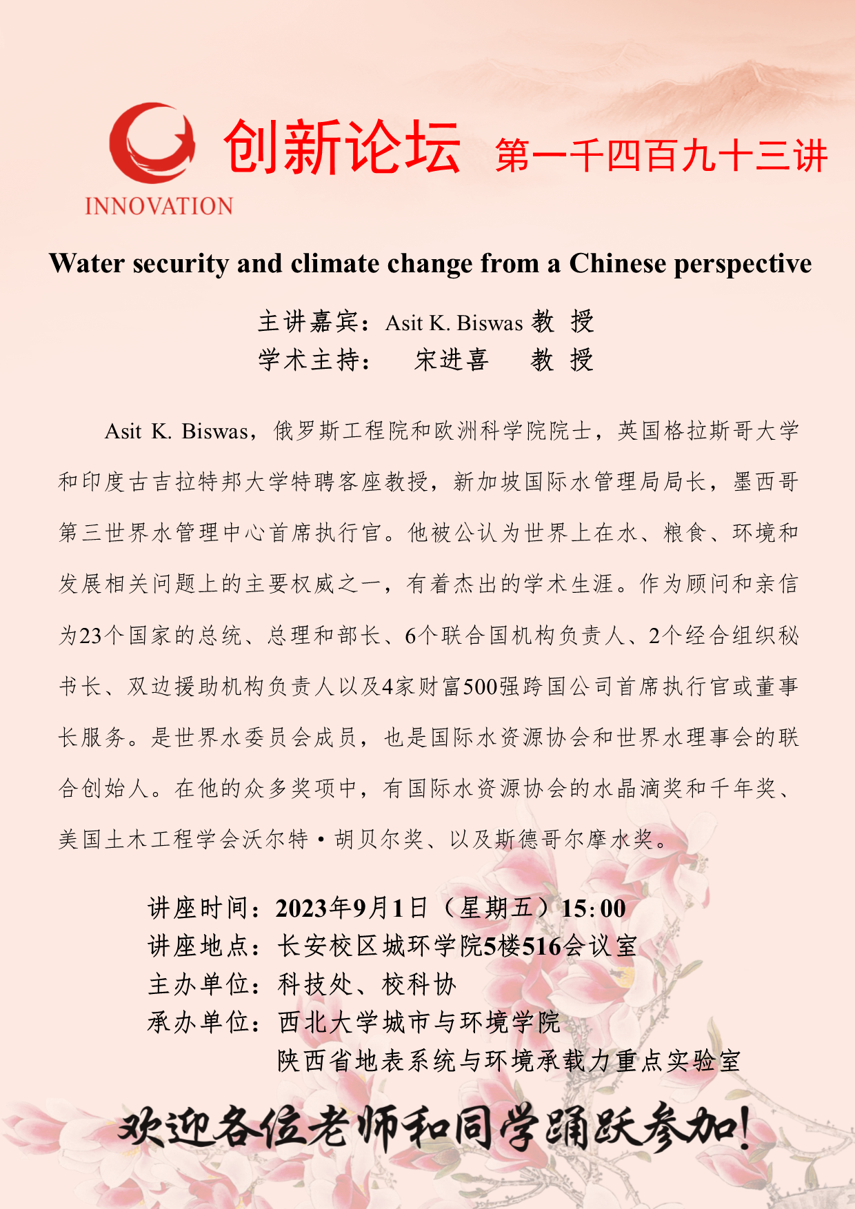 Asit K. Biswas 教授 乐投平台创新论坛第一千四百九十三讲:Water security and climate change from a Chinese perspective 讲座时间 2023年9月1日(星期五)15:00 讲座地点 长安校区城环学院5楼516会议室 讲座人介绍 Asit K. Biswas 教授 讲座内容