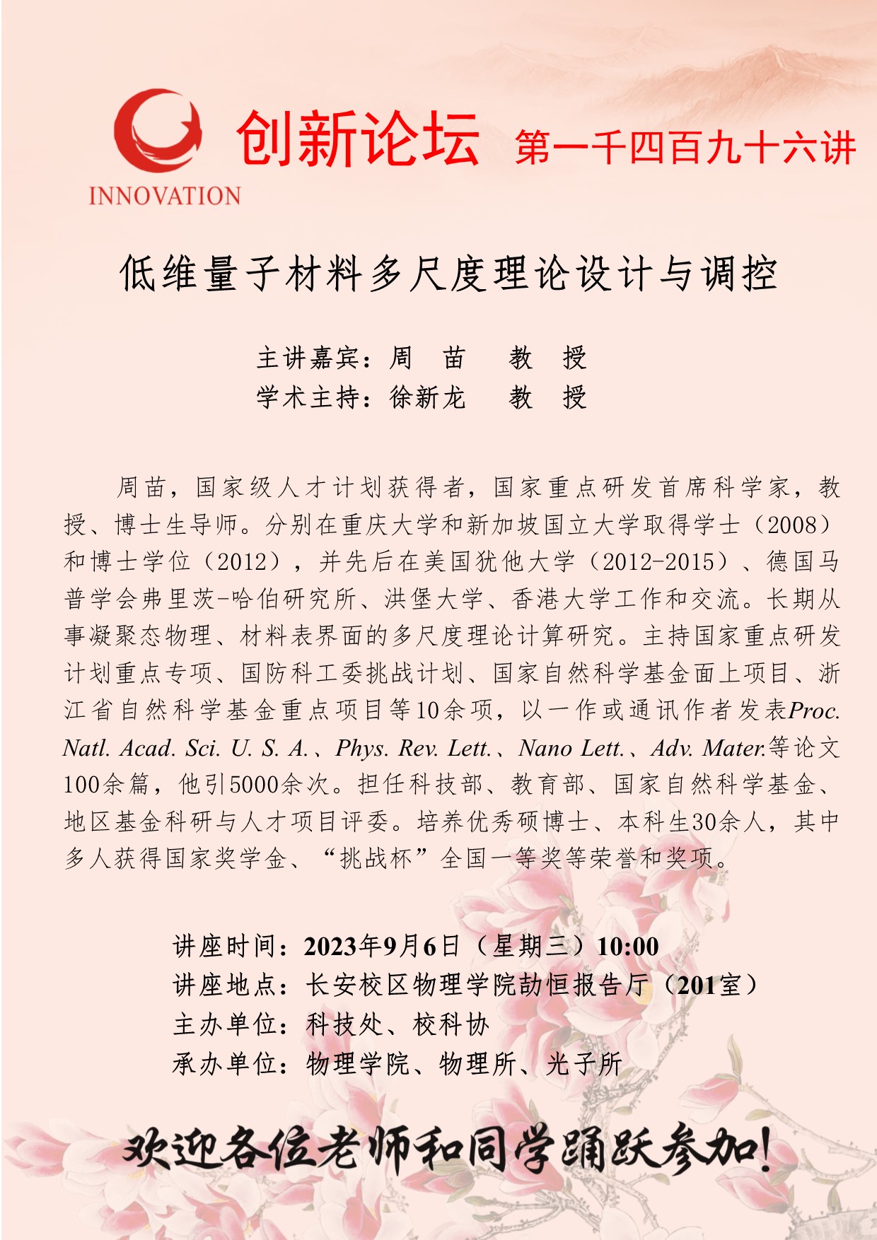周苗 教授 乐投平台创新论坛第一千四百九十六讲:低维量子材料多尺度理论设计与调控 讲座时间 2023年9月6日(星期三)10:00 讲座地点 长安校区物理学院劼恒报告厅(201室) 讲座人介绍 周苗 教授 讲座内容