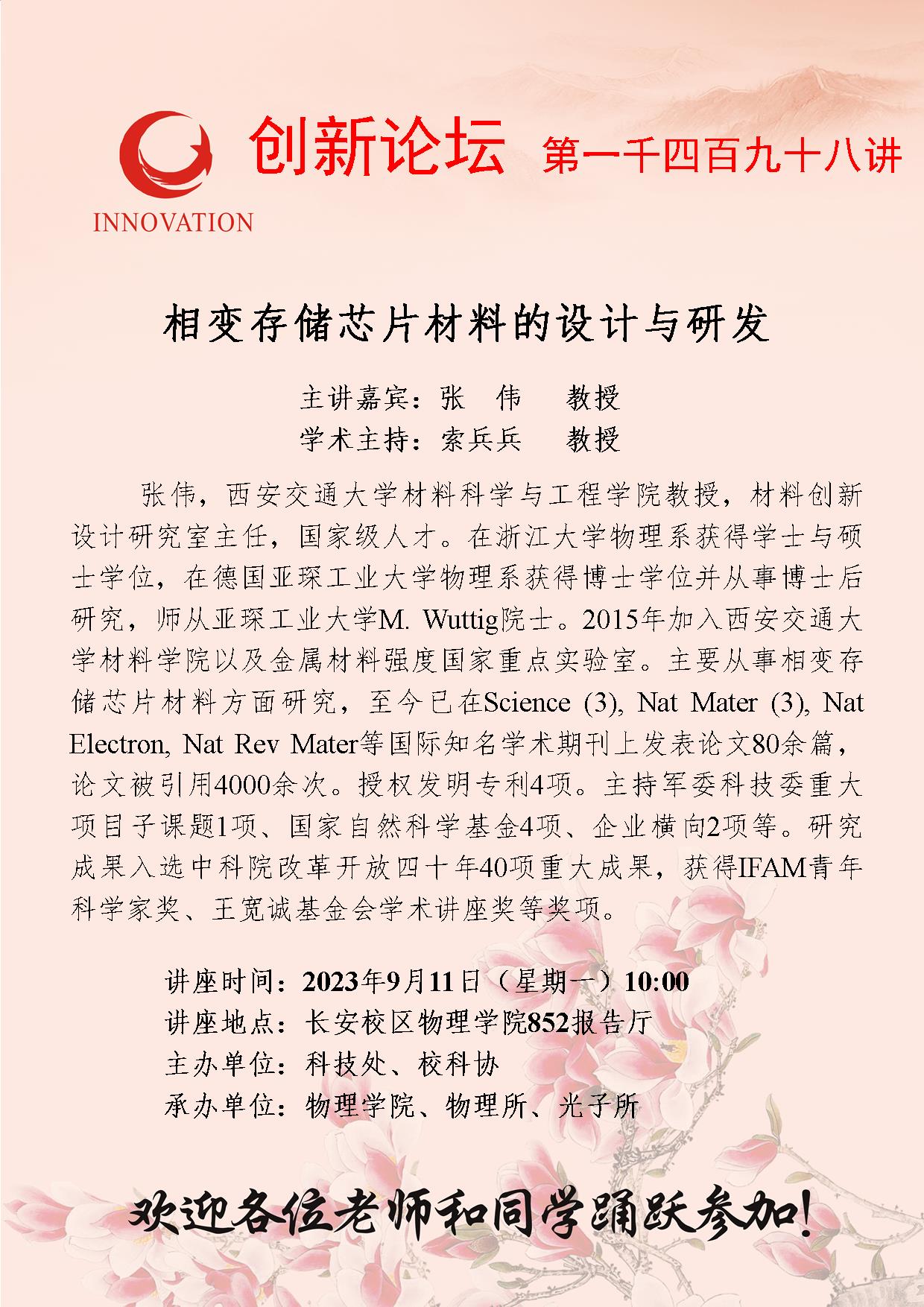 张伟 教授 乐投平台创新论坛第一千四百九十八讲:相变存储芯片材料的设计与研发 讲座时间 2023年9月11日(星期一) 10:00 讲座地点 长安校区物理学院852报告厅 讲座人介绍 张伟 教授 讲座内容