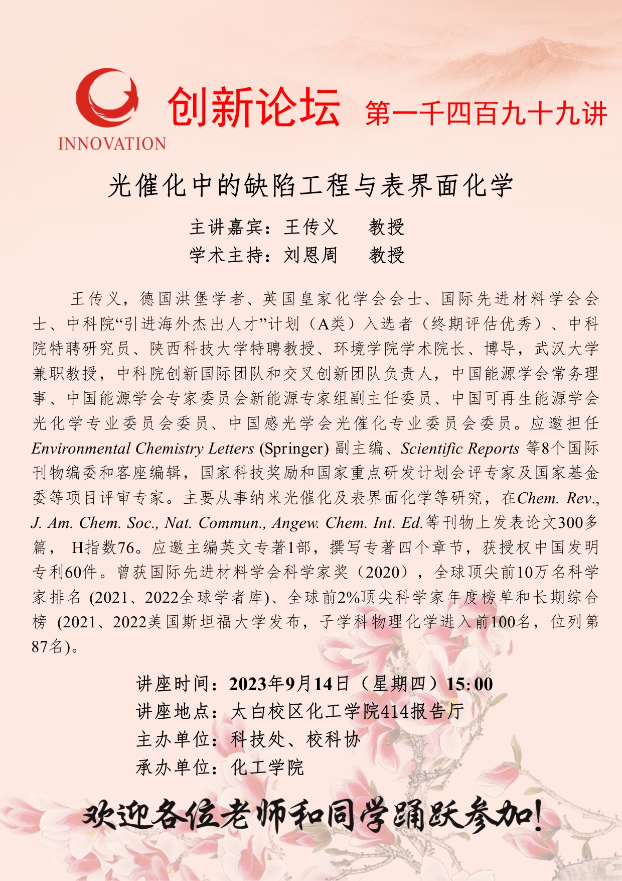 王传义 教授 乐投平台创新论坛第一千四百九十九讲:光催化中的缺陷工程与表界面化学 讲座时间 2023年9月14日(星期四)15:00 讲座地点 太白校区化工学院414报告厅 讲座人介绍 王传义 教授 讲座内容
