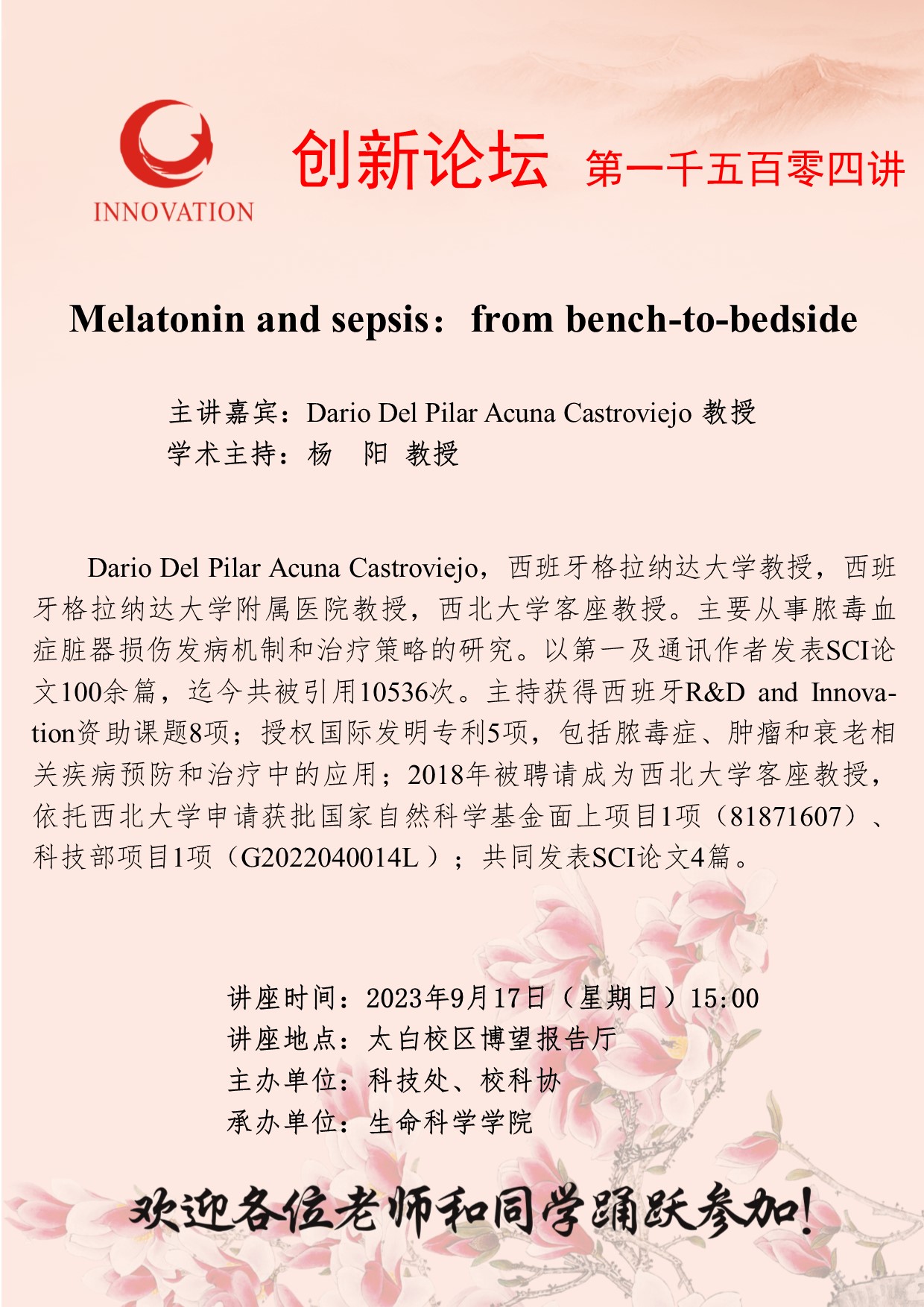 Dario Del Pilar Acuna Castroviejo 教授 乐投平台创新论坛第一千五百零四讲:Melatonin and sepsis:from bench-to-bedside 讲座时间 2023年9月17日(星期日)15:00 讲座地点 太白校区博望报告厅 讲座人介绍 Dario Del Pilar Acuna Castroviejo 教授 讲座内容