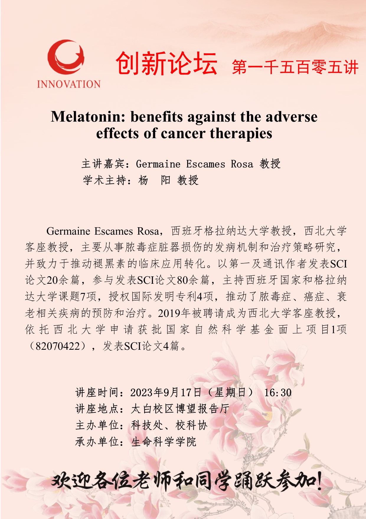 Germaine Escames Rosa 教授 乐投平台创新论坛第一千五百零五讲:Melatonin: benefits against the adverse effects of cancer therapies 讲座时间 2023年9月17日(星期日) 16:30 讲座地点 太白校区博望报告厅 讲座人介绍 Germaine Escames Rosa 教授 讲座内容