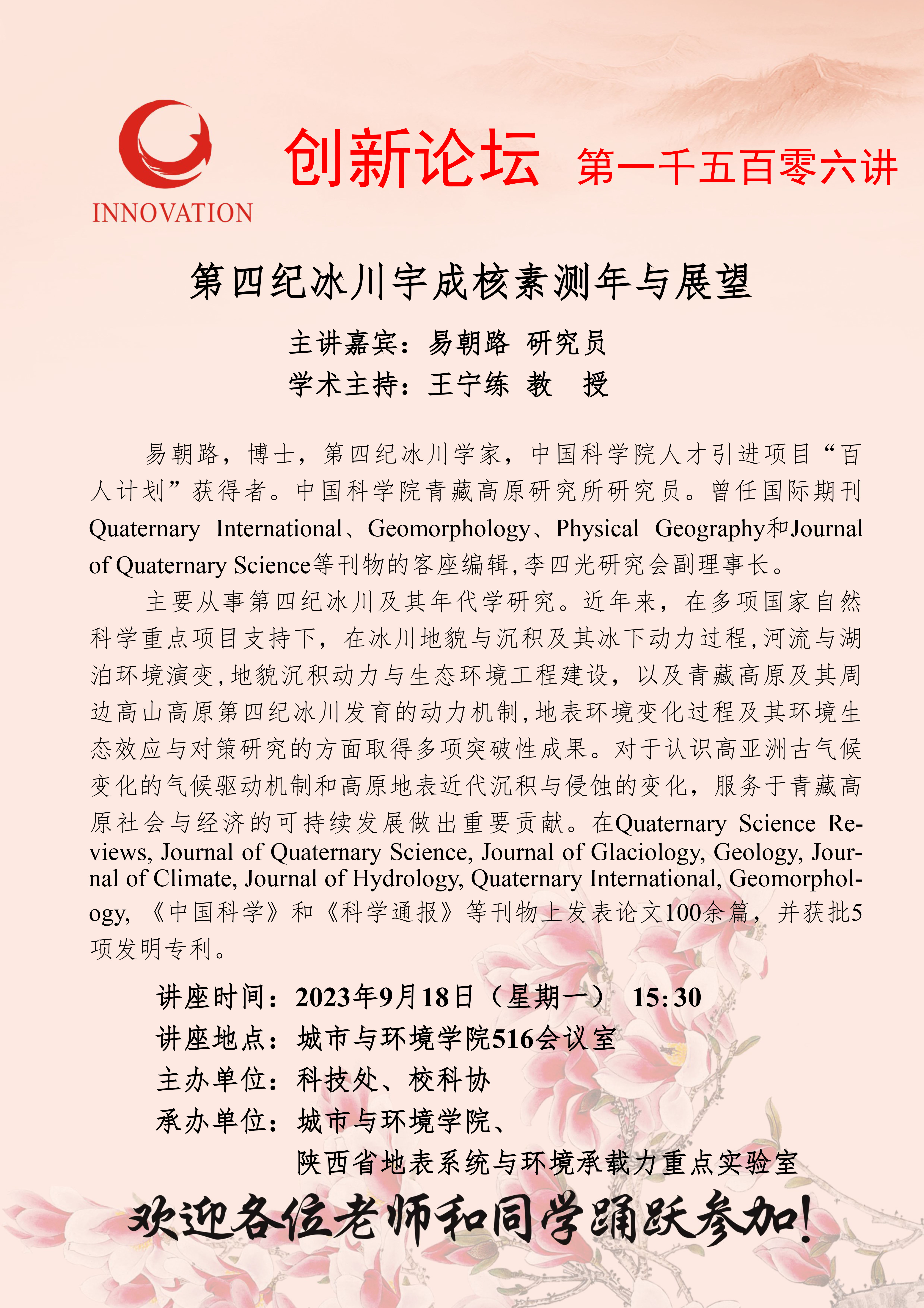 易朝路 研究员 乐投平台创新论坛第一千五百零六讲:第四纪冰川宇成核素测年与展望 讲座时间 2023年9月18日(星期一)15:30 讲座地点 城市与环境学院516会议室 讲座人介绍 易朝路 研究员 讲座内容