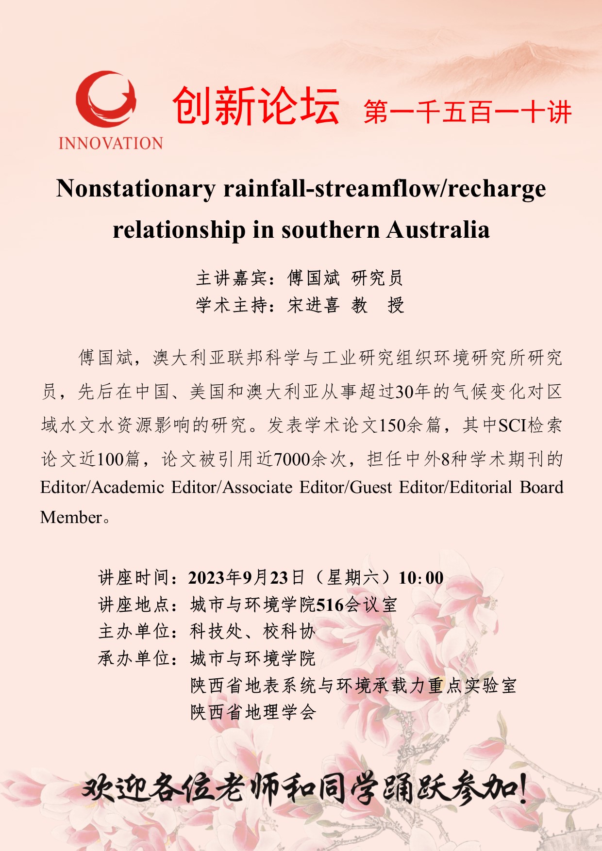 傅国斌 研究员 乐投平台创新论坛第一千五百一十讲:Nonstationary rainfall‐streamflow/recharge relationship in southern Australia 讲座时间 2023年9月23日(星期六)10:00 讲座地点 城市与环境学院516会议室 讲座人介绍 傅国斌 研究员 讲座内容
