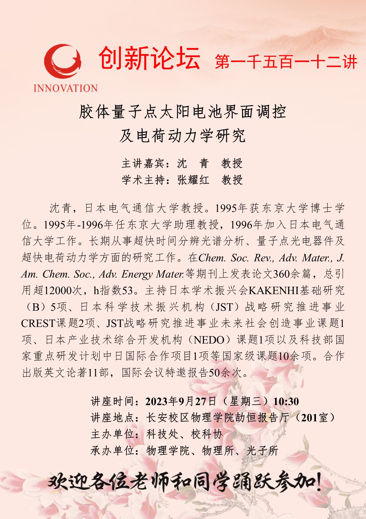 沈青 教授 乐投平台创新论坛第一千五百一十二讲:胶体量子点太阳电池界面调控及电荷动力学研究 讲座时间 2023年9月27日(星期三)10:30 讲座地点 长安校区物理学院劼恒报告厅(201室) 讲座人介绍 沈青 教授 讲座内容