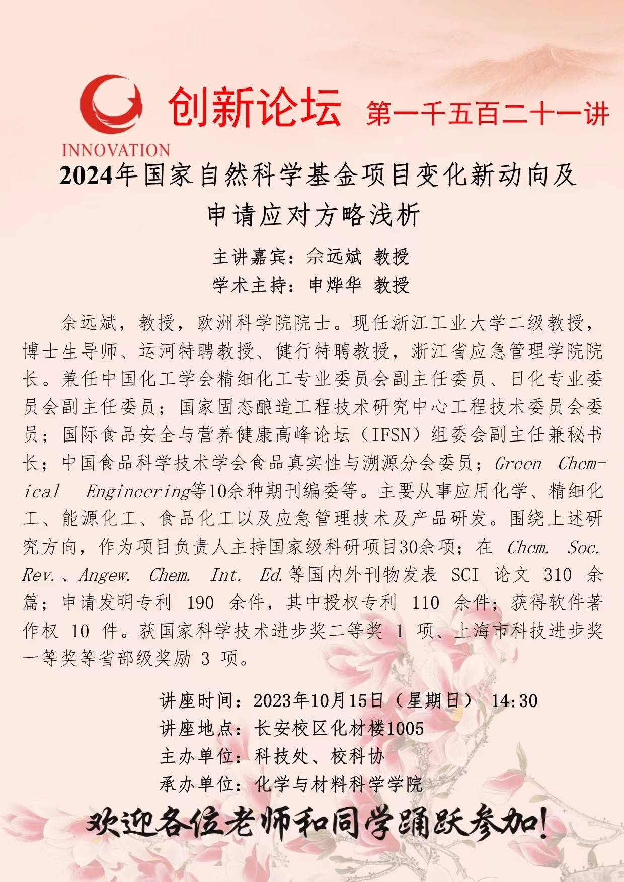 佘远斌 教授 乐投平台创新论坛第一千五百二十一讲: 2024年国家自然科学基金项目变化新动向及申请应对方略浅析 讲座时间 2023年10月15日(星期日) 14:30 讲座地点 长安校区化材楼1005 讲座人介绍 佘远斌 教授 讲座内容