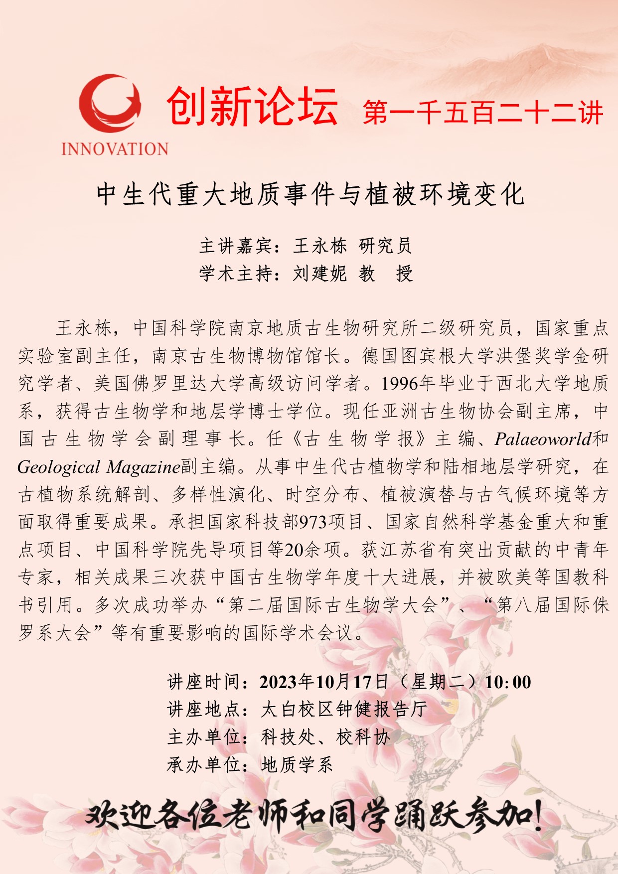 王永栋 研究员 乐投平台创新论坛第一千五百二十二讲:中生代重大地质事件与植被环境变化 讲座时间 2023年10月17日(星期二)10:00 讲座地点 太白校区钟健报告厅 讲座人介绍 王永栋 研究员 讲座内容