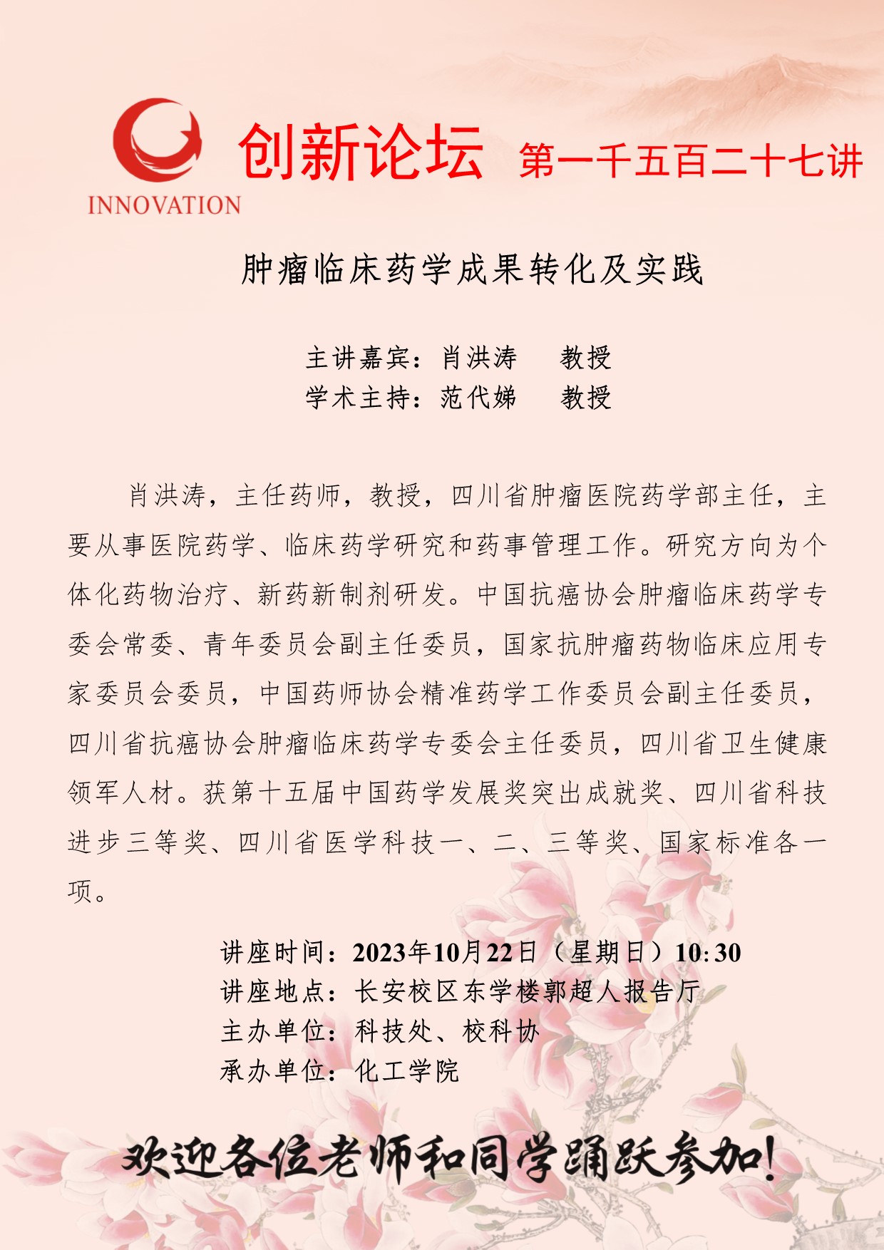 肖洪涛 教授 乐投平台创新论坛第一千五百二十七讲:肿瘤临床药学成果转化及实践 讲座时间 2023年10月22日(星期日)10:30 讲座地点 长安校区东学楼郭超人报告厅 讲座人介绍 肖洪涛 教授 讲座内容