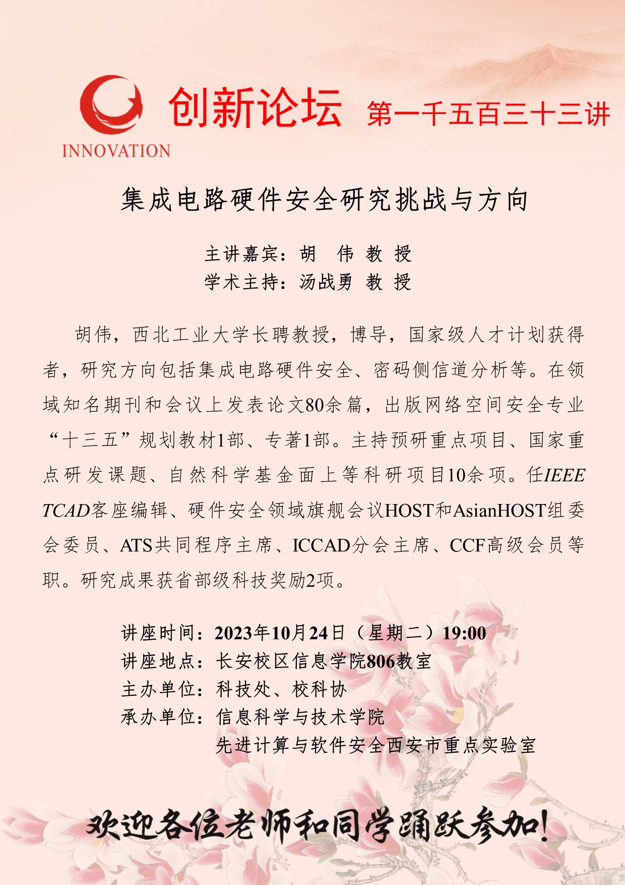 胡 伟 教授 乐投平台创新论坛第一千五百三十三讲:集成电路硬件安全研究挑战与方向 讲座时间 2023年10月24日(星期二)19:00 讲座地点 长安校区信息学院806教室 讲座人介绍 胡 伟 教授 讲座内容