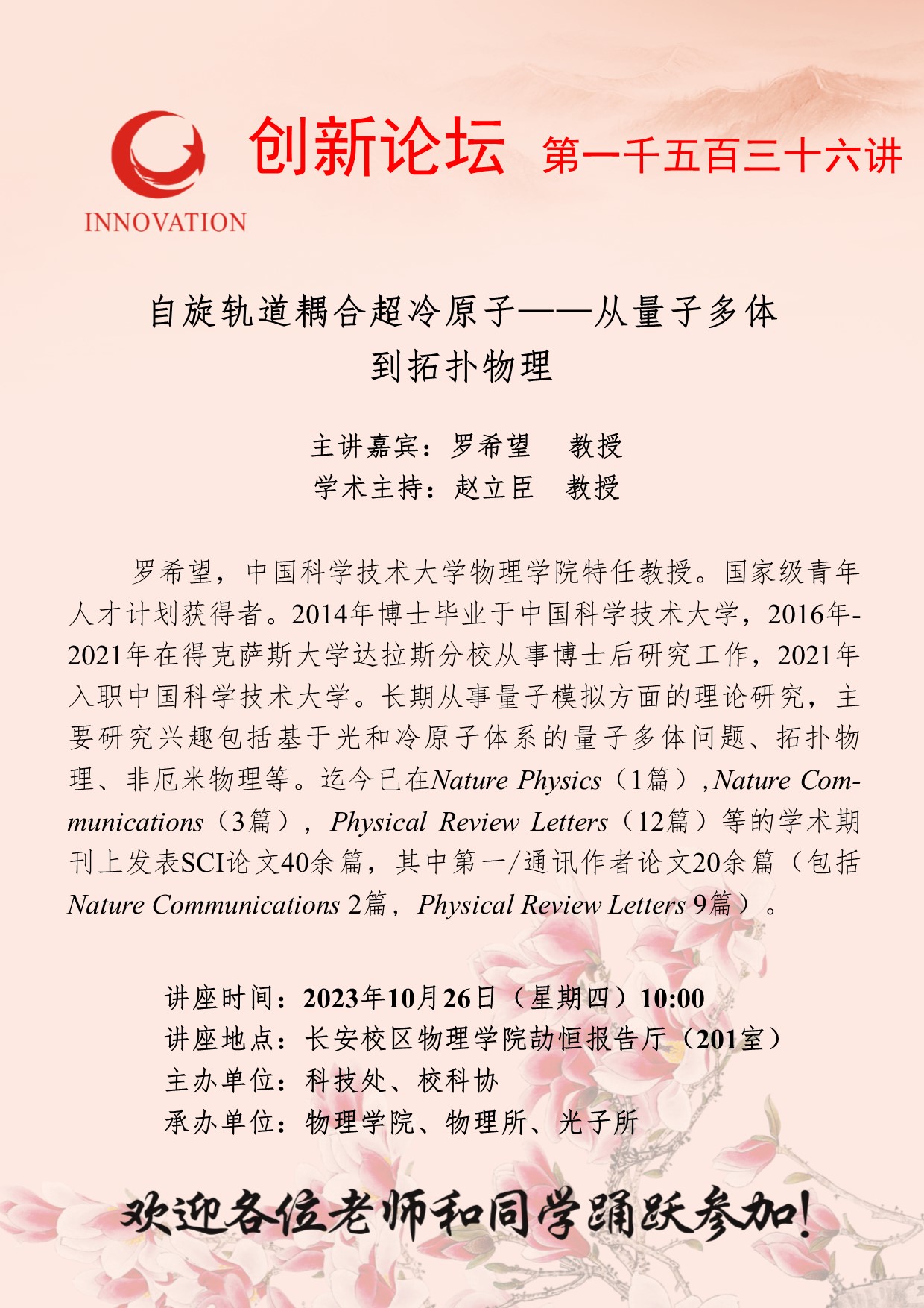 罗希望 教授 乐投平台创新论坛第一千五百三十六讲:自旋轨道耦合超冷原子——从量子多体到拓扑物理 讲座时间 2023年10月26日(星期四)10:00 讲座地点 长安校区物理学院劼恒报告厅(201室) 讲座人介绍 罗希望 教授 讲座内容
