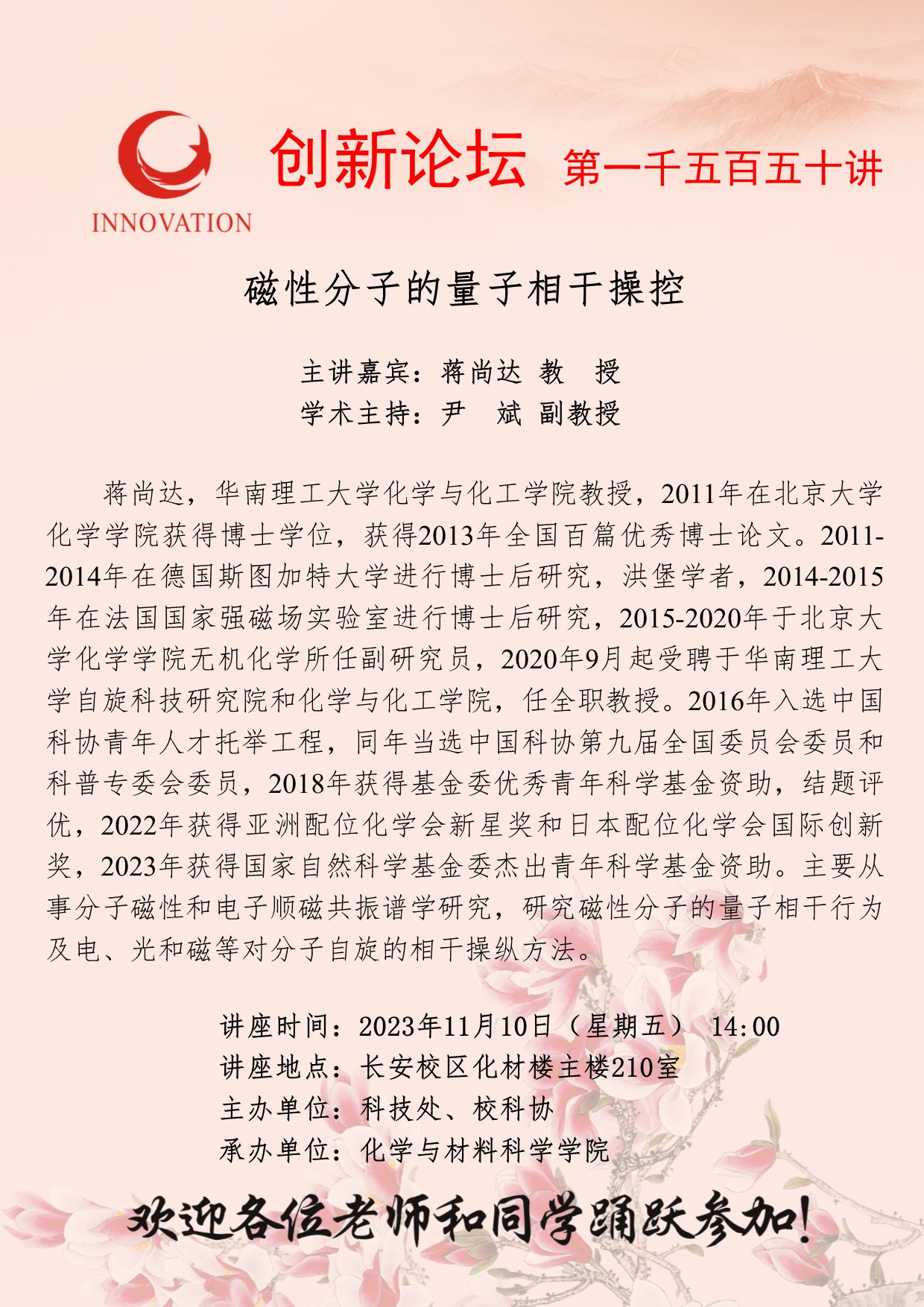 蒋尚达 教 授 乐投平台创新论坛第一千五百五十讲: 磁性分子的量子相干操控 讲座时间 2023年11月10日(星期五) 14:00 讲座地点 长安校区化材楼主楼210室 讲座人介绍 蒋尚达 教 授 讲座内容