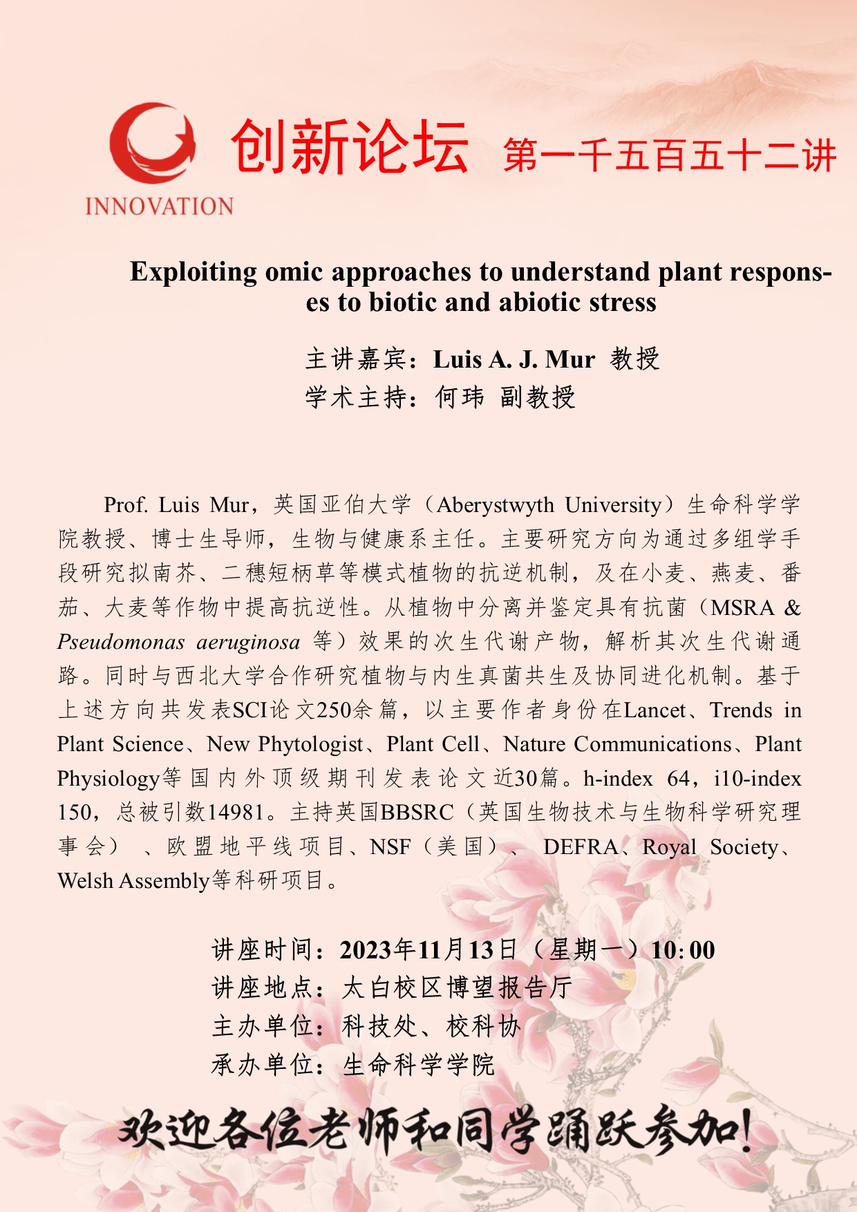 Luis A. J. Mur 教授 乐投平台创新论坛第一千五百五十二讲:Exploiting omic approaches to understand plant responses to biotic and abiotic stress 讲座时间 2023年11月13日(星期一)10:00 讲座地点 太白校区博望报告厅 讲座人介绍 Luis A. J. Mur 教授 讲座内容
