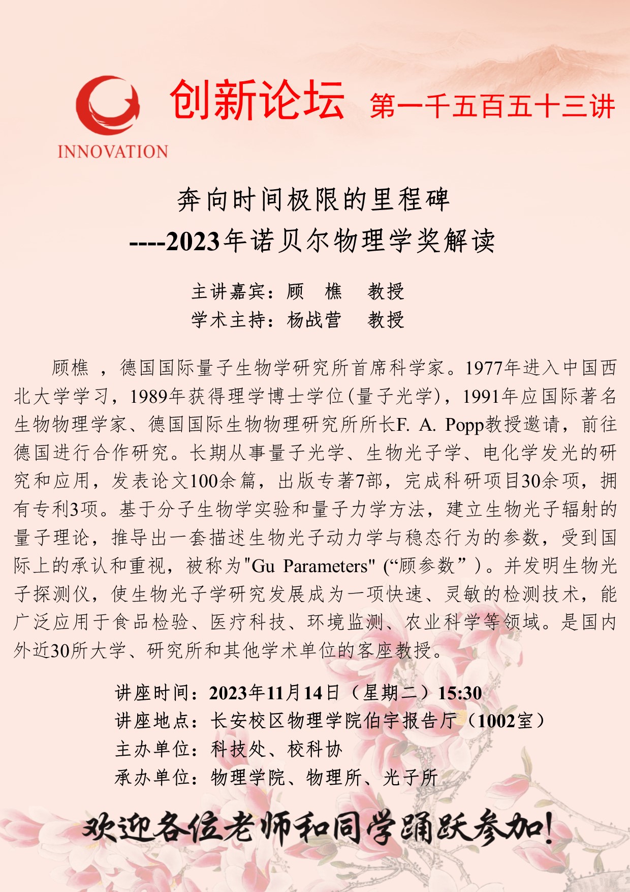 顾樵 教授 乐投平台创新论坛第一千五百五十三讲:奔向时间极限的里程碑----2023年诺贝尔物理学奖解读 讲座时间 2023年11月14日(星期二)15:30 讲座地点 长安校区物理学院伯宇报告厅(1002室) 讲座人介绍 顾樵 教授 讲座内容