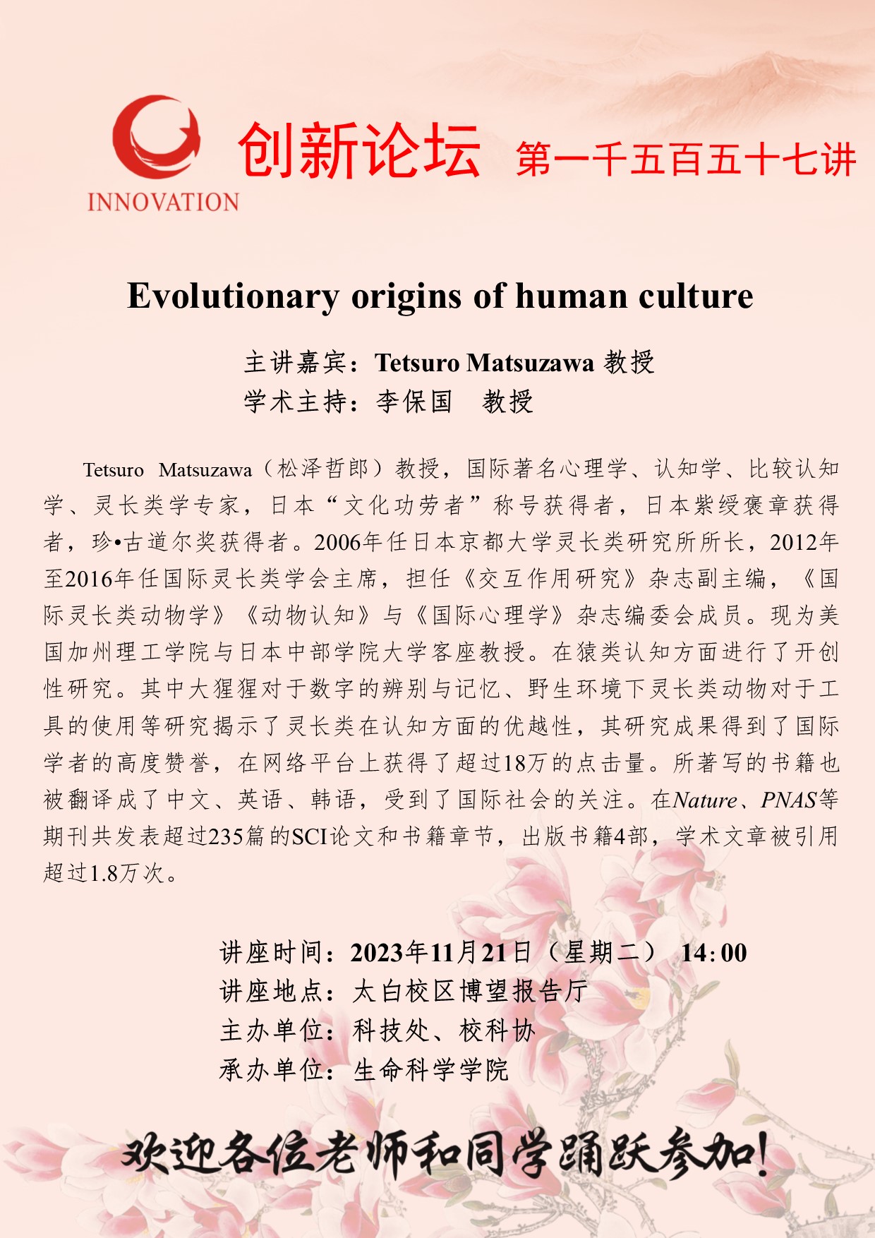 Tetsuro Matsuzawa 教授 乐投平台创新论坛第一千五百五十七讲:Evolutionary origins of human culture 讲座时间 2023年11月21日(星期二) 14:00 讲座地点 太白校区博望报告厅 讲座人介绍 Tetsuro Matsuzawa 教授 讲座内容