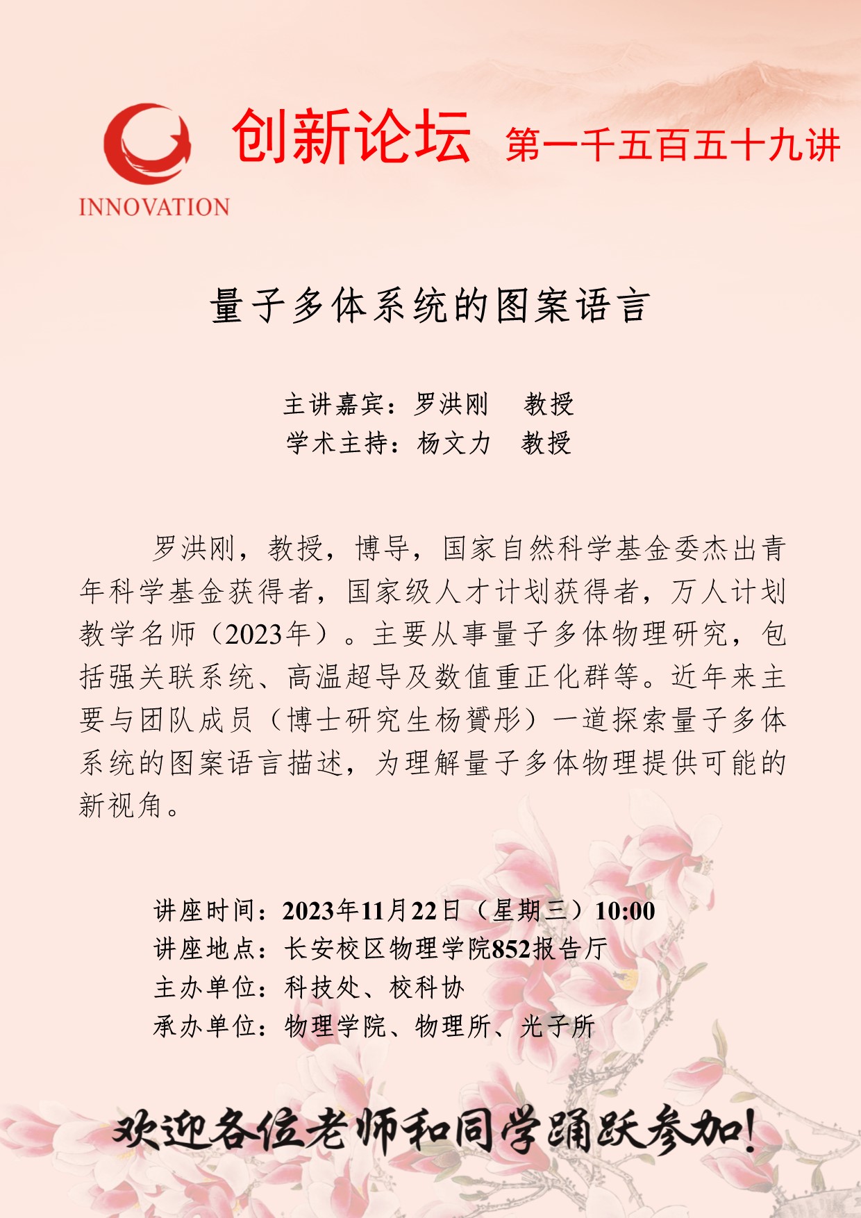 罗洪刚 教授 乐投平台创新论坛第一千五百五十九讲:量子多体系统的图案语言 讲座时间 2023年11月22日(星期三)10:00 讲座地点 长安校区物理学院852报告厅 讲座人介绍 罗洪刚 教授 讲座内容