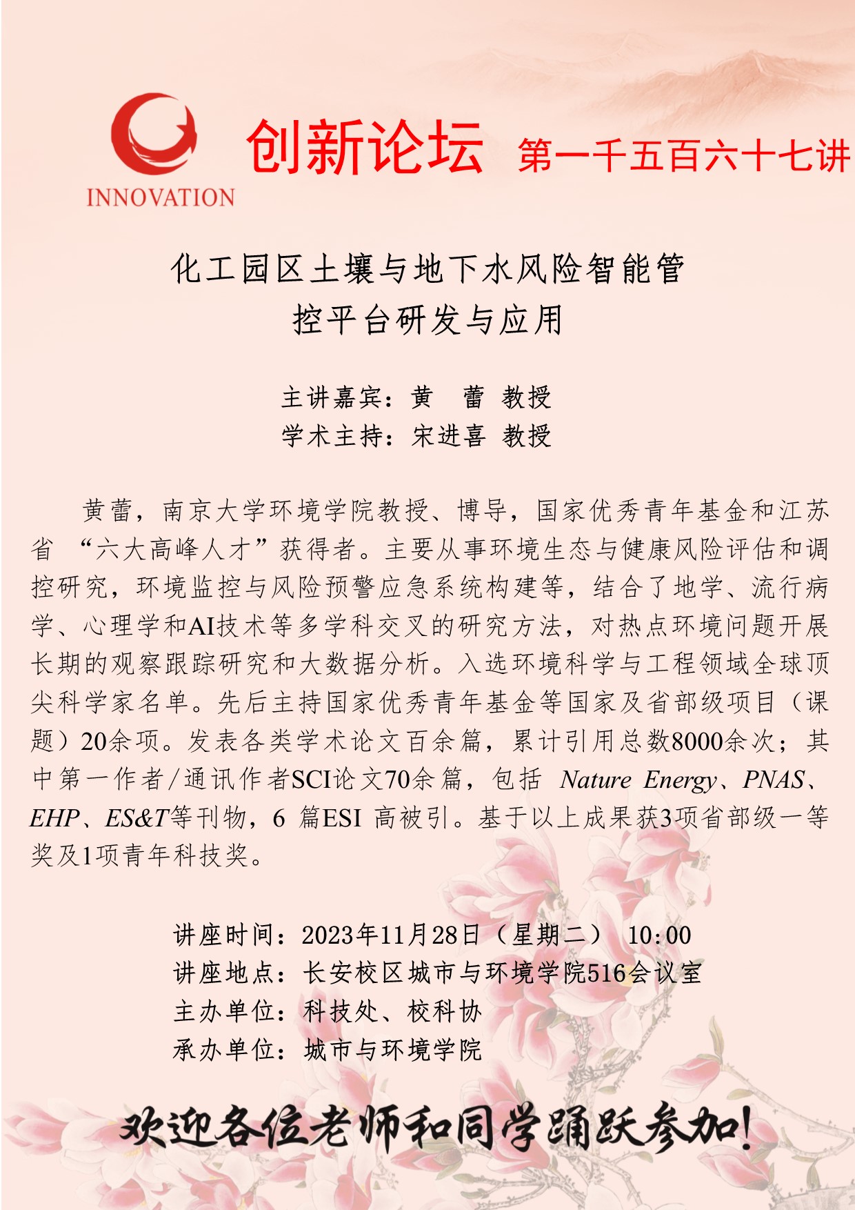 黄蕾 教授 乐投平台创新论坛第一千五百六十七讲:化工园区土壤与地下水风险智能管控平台研发与应用 讲座时间 2023年11月28日(星期二) 10:00 讲座地点 长安校区城市与环境学院516会议室 讲座人介绍 黄蕾 教授 讲座内容