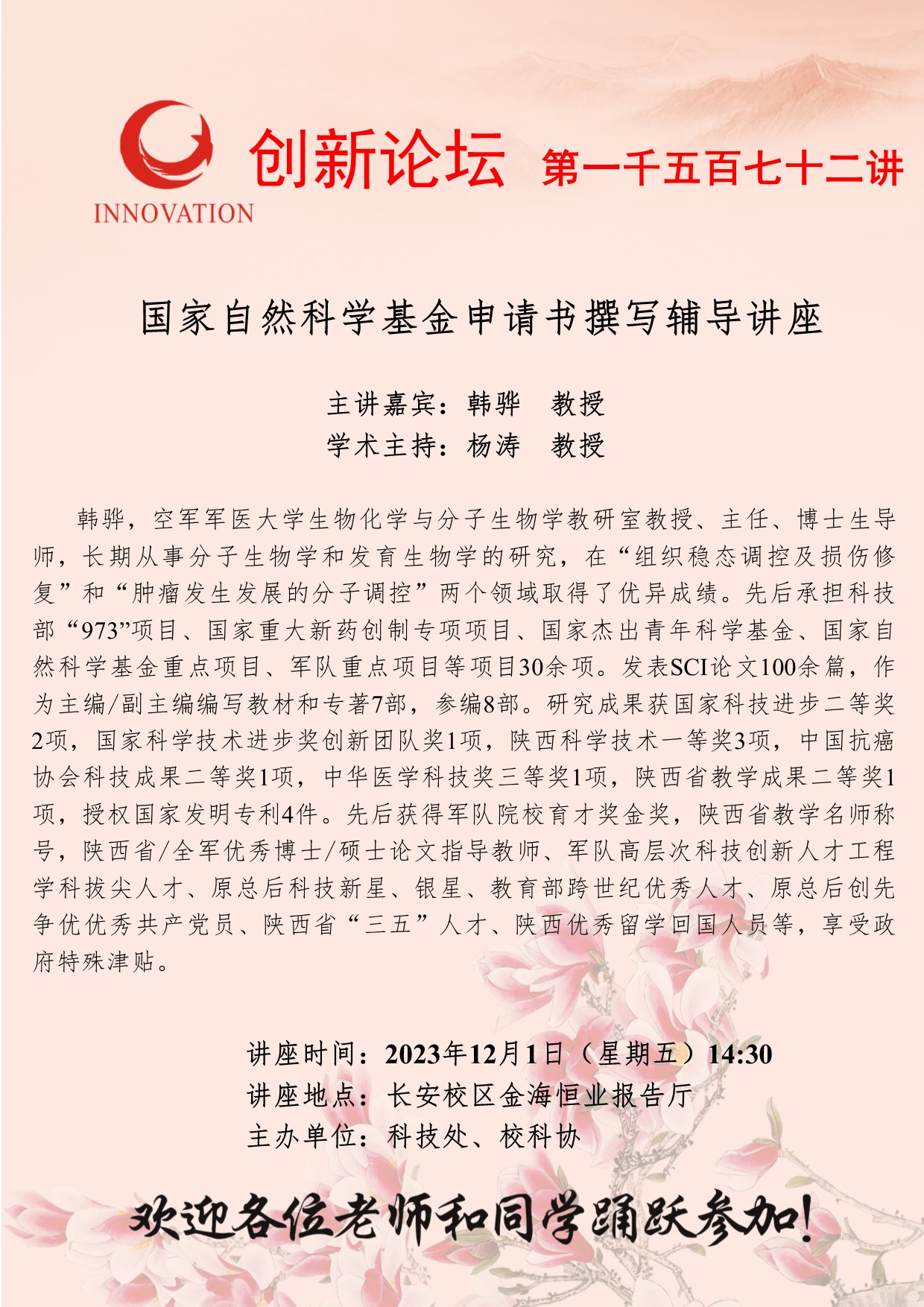 韩骅 教授 乐投平台创新论坛第一千五百七十二讲:国家自然科学基金申请书撰写辅导讲座 讲座时间 2023年12月1日(星期五)14:30 讲座地点 长安校区金海恒业报告厅 讲座人介绍 韩骅 教授 讲座内容