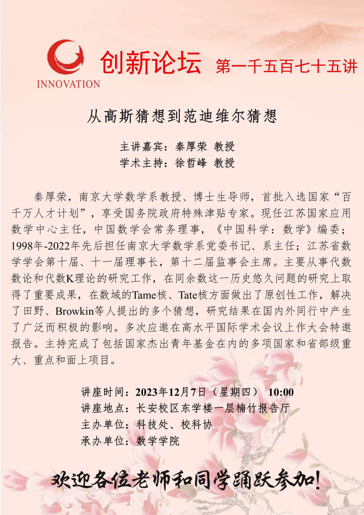秦厚荣 教授 乐投平台创新论坛第一千五百七十五讲:从高斯猜想到范迪维尔猜想 讲座时间 2023年12月7日(星期四) 10:00 讲座地点 长安校区东学楼一层楠竹报告厅 讲座人介绍 秦厚荣 教授 讲座内容