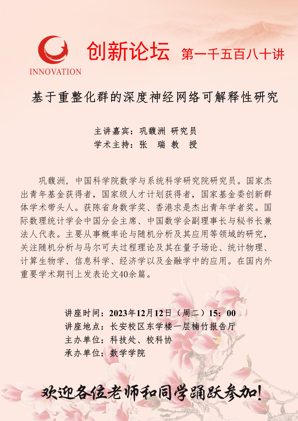 巩馥洲 研究员 乐投平台创新论坛第一千五百八十讲:基于重整化群的深度神经网络可解释性研究 讲座时间 2023年12月12日(周二)15:00 讲座地点 长安校区东学楼一层楠竹报告厅 讲座人介绍 巩馥洲 研究员 讲座内容