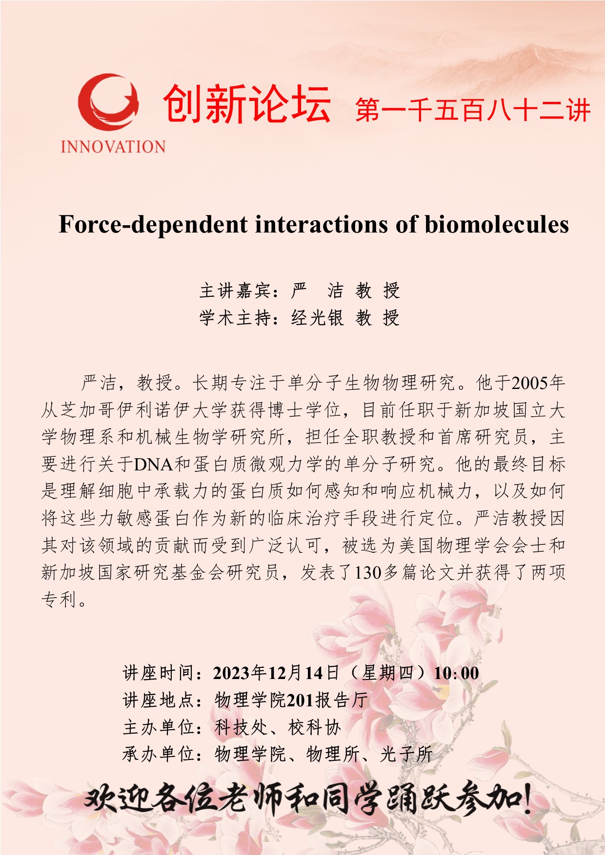 严洁 教授 乐投平台创新论坛第一千五百八十二讲:Force-dependent interactions of biomolecules 讲座时间 2023年12月14日(星期四)10:00 讲座地点 物理学院201报告厅 讲座人介绍 严洁 教授 讲座内容