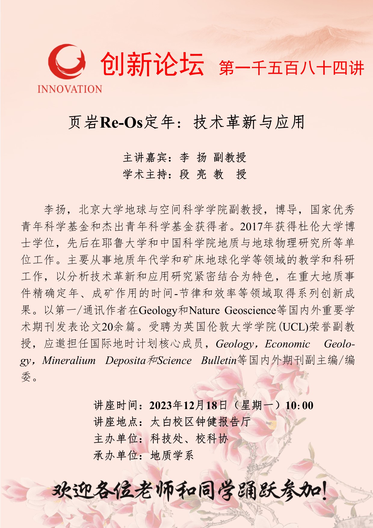 李扬 副教授 乐投平台创新论坛第一千五百八十四讲:页岩Re-Os定年: 技术革新与应用 讲座时间 2023年12月18日(星期一)10:00 讲座地点 太白校区钟健报告厅 讲座人介绍 李扬 副教授 讲座内容