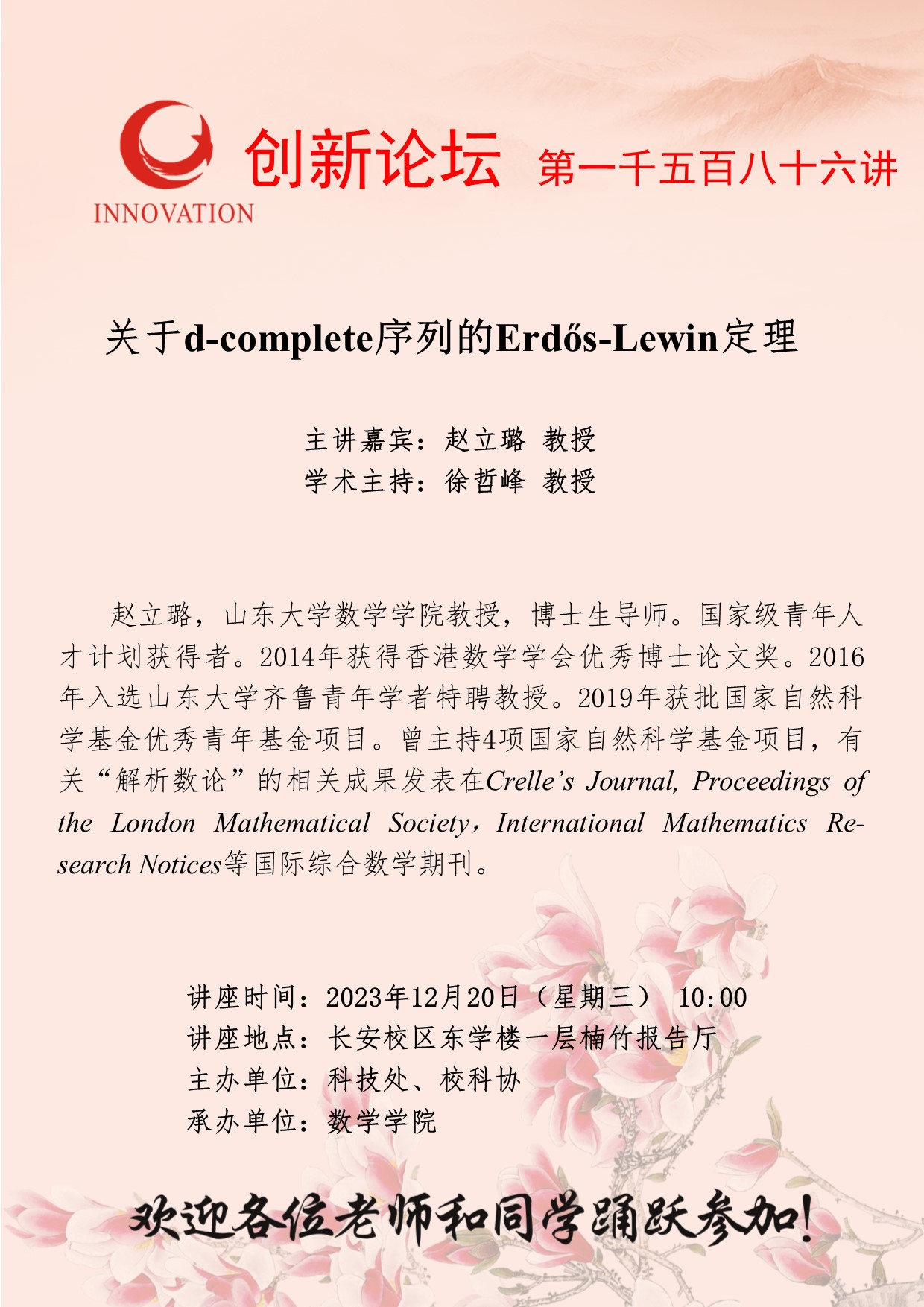 赵立璐 教授 乐投平台创新论坛第一千五百八十六讲:关于d-complete序列的Erdős-Lewin定理 讲座时间 2023年12月20日(星期三) 10:00 讲座地点 长安校区东学楼一层楠竹报告厅 讲座人介绍 赵立璐 教授 讲座内容