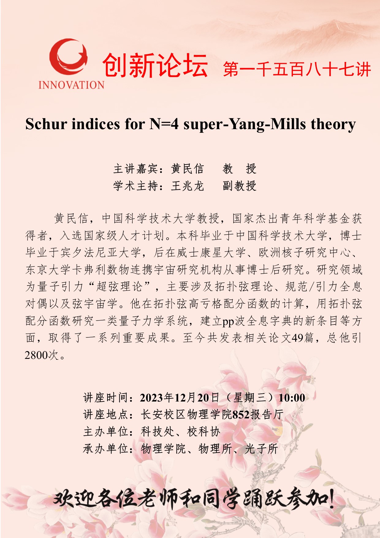 黄民信 教 授 乐投平台创新论坛第一千五百八十七讲:Schur indices for N=4 super-Yang-Mills theory 讲座时间 2023年12月20日(星期三)10:00 讲座地点 长安校区物理学院852报告厅 讲座人介绍 黄民信 教 授 讲座内容