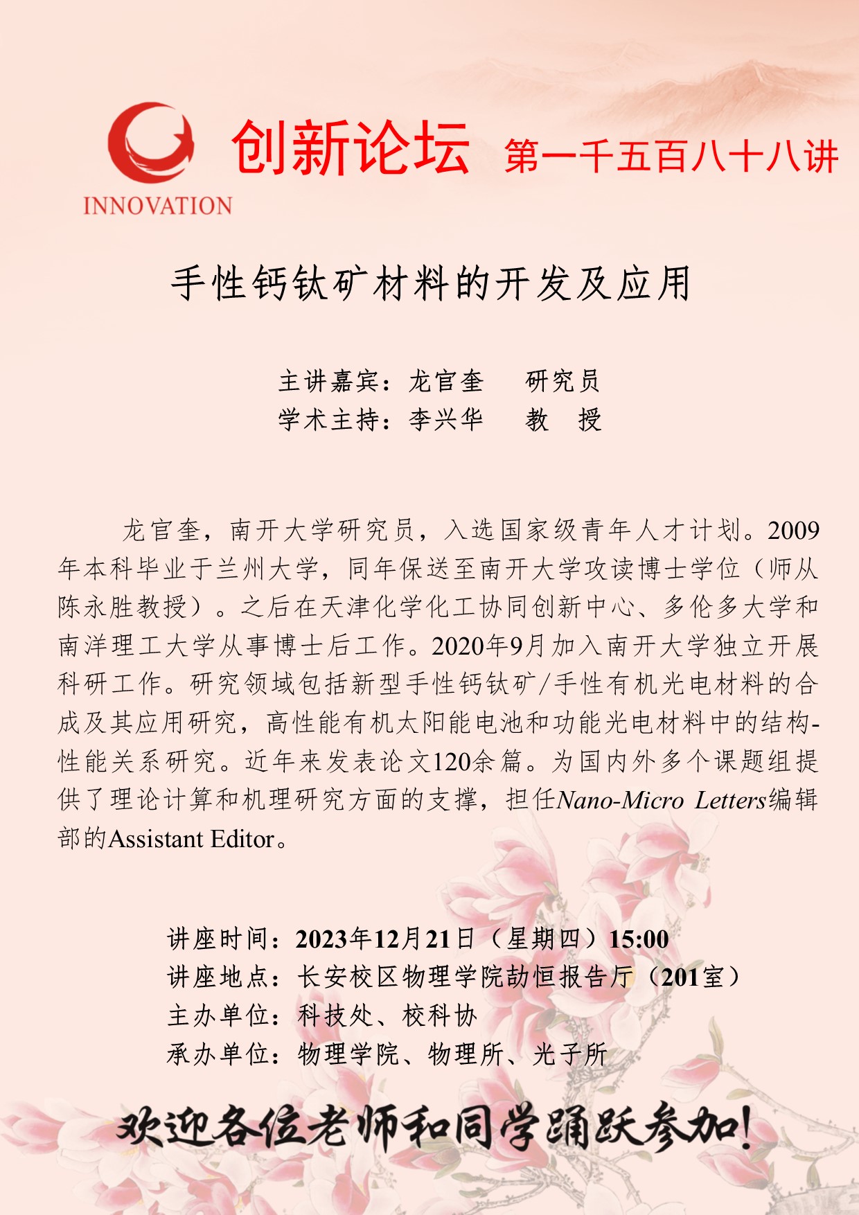 龙官奎 研究员 乐投平台创新论坛第一千五百八十八讲:手性钙钛矿材料的开发及应用 讲座时间 2023年12月21日(星期四)15:00 讲座地点 长安校区物理学院劼恒报告厅(201室) 讲座人介绍 龙官奎 研究员 讲座内容