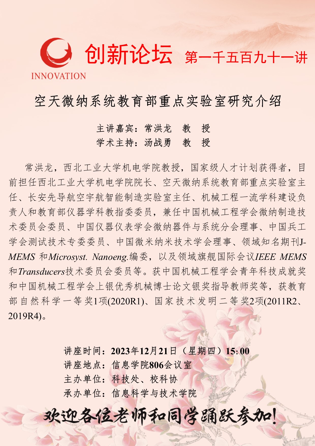 常洪龙 教授 乐投平台创新论坛第一千五百九十一讲:空天微纳系统教育部重点实验室研究介绍 讲座时间 2023年12月21日(星期四)15:00 讲座地点 信息学院806会议室 讲座人介绍 常洪龙 教授 讲座内容
