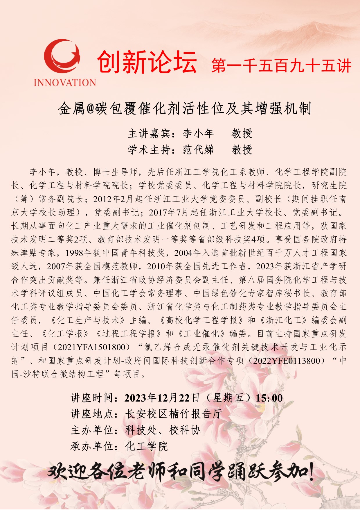 李小年 教授 乐投平台创新论坛第一千五百九十五讲:金属@碳包覆催化剂活性位及其增强机制 讲座时间 2023年12月22日(星期五)15:00 讲座地点 长安校区楠竹报告厅 讲座人介绍 李小年 教授 讲座内容