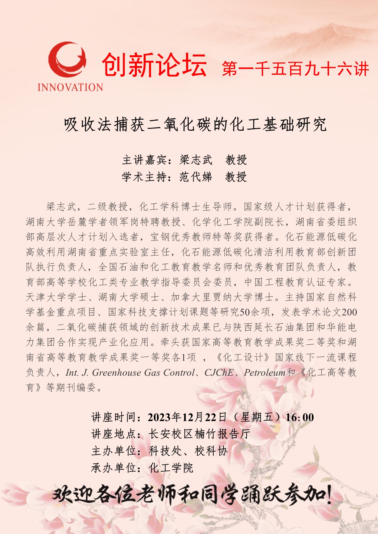 梁志武 教授 乐投平台创新论坛第一千五百九十六讲:吸收法捕获二氧化碳的化工基础研究 讲座时间 2023年12月22日(星期五)16:00 讲座地点 长安校区楠竹报告厅 讲座人介绍 梁志武 教授 讲座内容